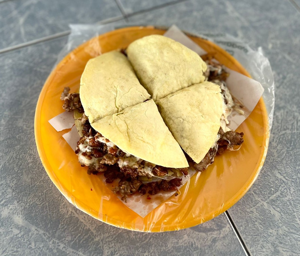 Platillo personal de 1 taco (tortilla de maíz) de alambre, acompañado con papas a la francesa (aprox. 200 g) y hasta 3 complementos a elección: pepinos con rábanos, pico de gallo, chicharrón, cebolla con habanero, etc. Incluye limones y salsa aparte.