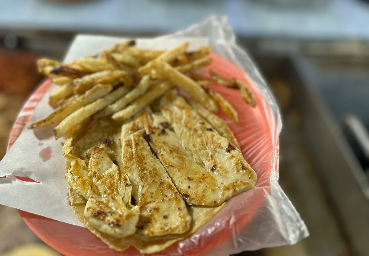 1 taco de pechuga asada, acompañado con papas a la francesa (aprox. 900 g) y hasta 3 complementos a elección: pepinos con rábanos, pico de gallo, chicharrón, cebolla con habanero, etc. Incluye limones.