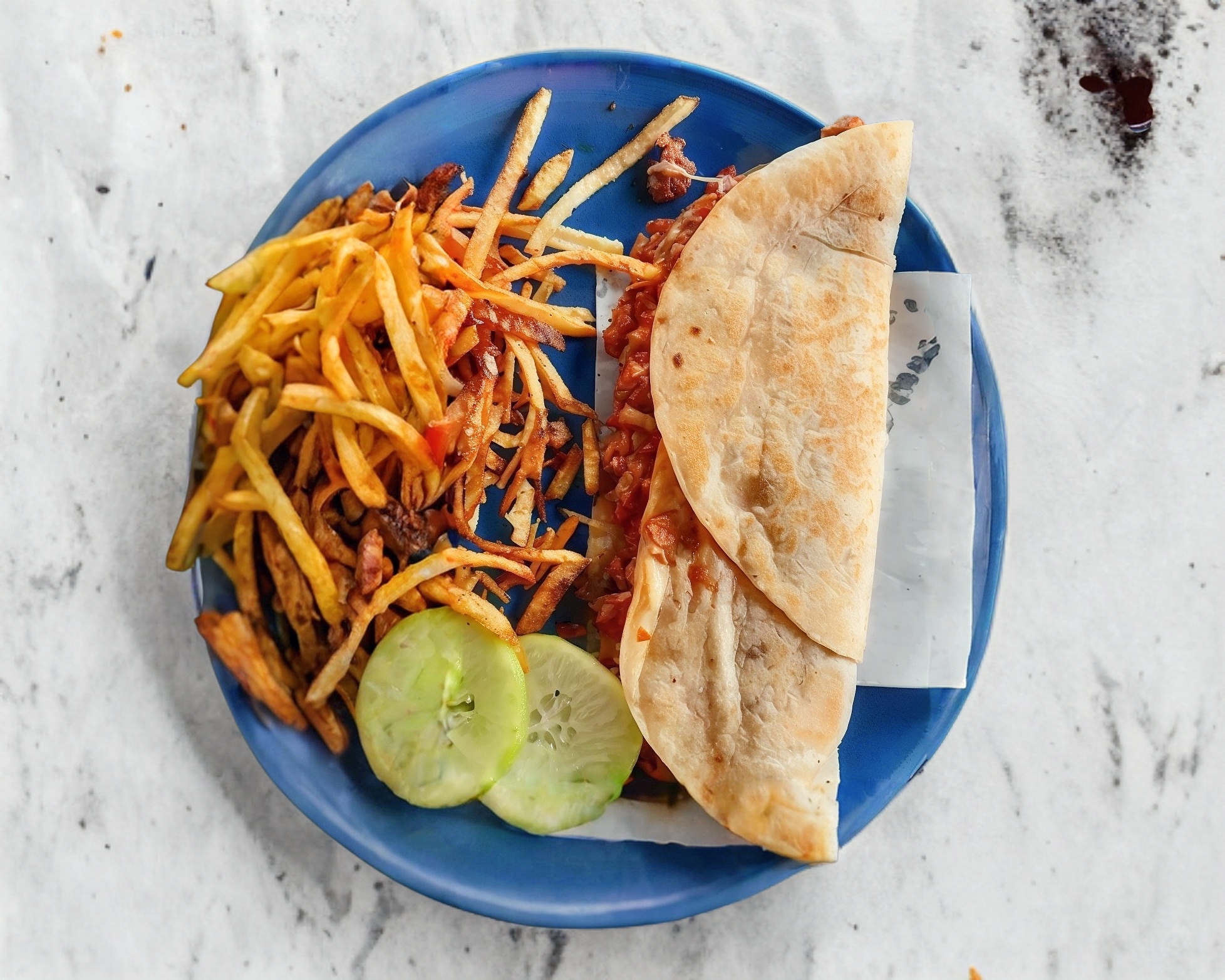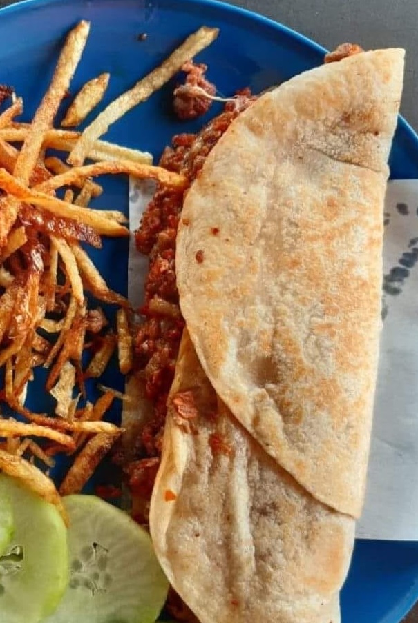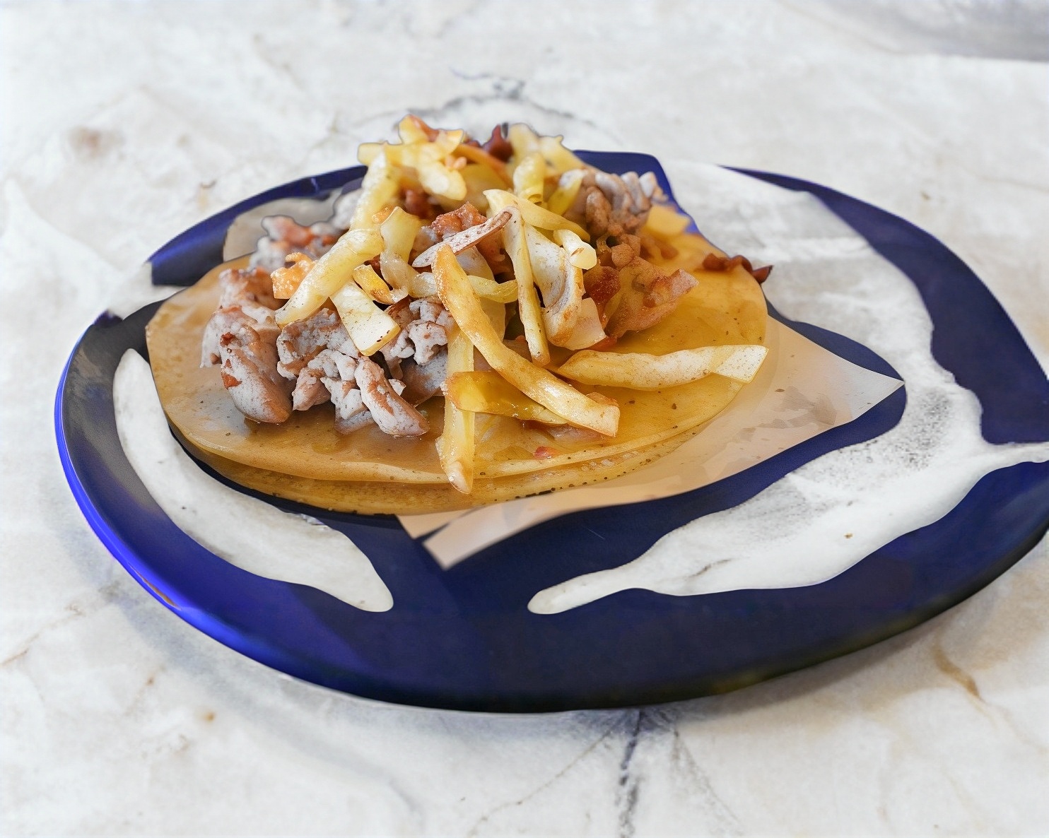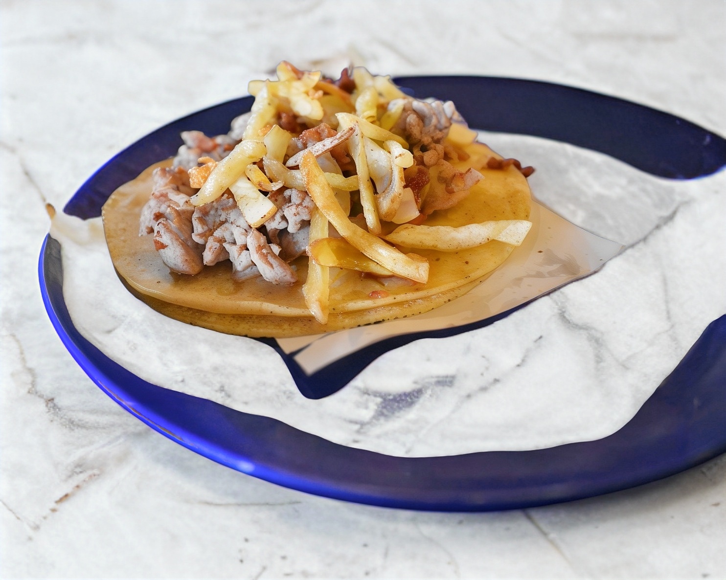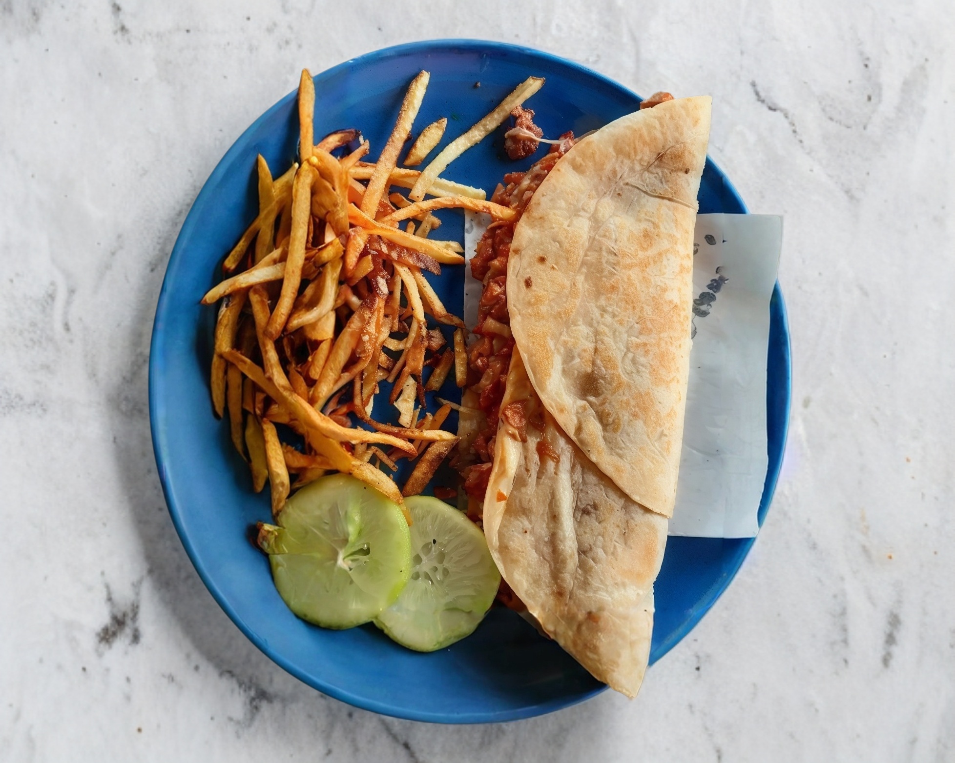 Dos tortillas de harina alargadas, queso oaxaca, cebolla cocida, y guarnicion de papas tipo francesa