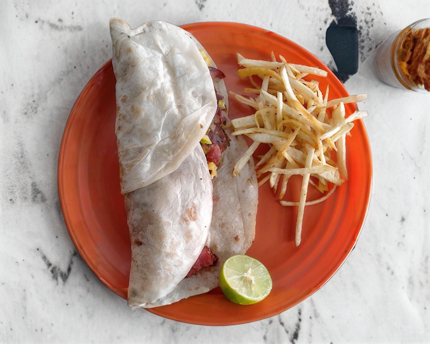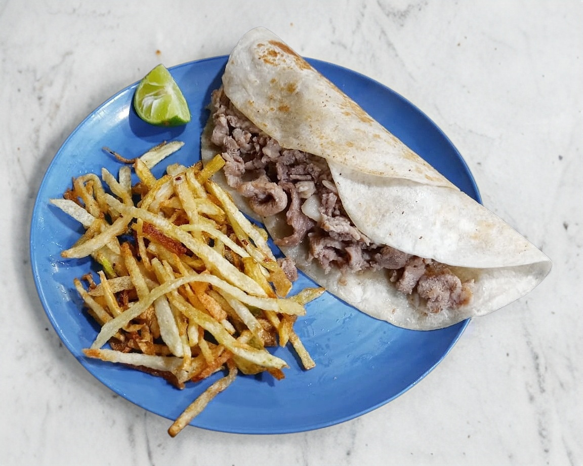 Tortilla de tamaño normal, Cebolla asada, y papas tipo francesa y limones