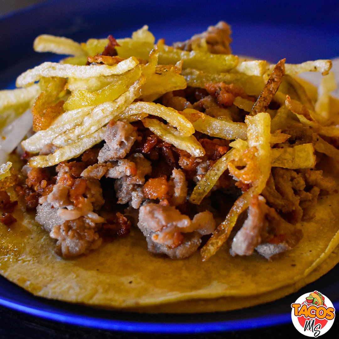 Taco por unidad, tortilla de tamaño normal de maíz doble, Bistec, Longaniza, Cebolla asada, papas tipo francesa y limones, Salsa verde o roja.