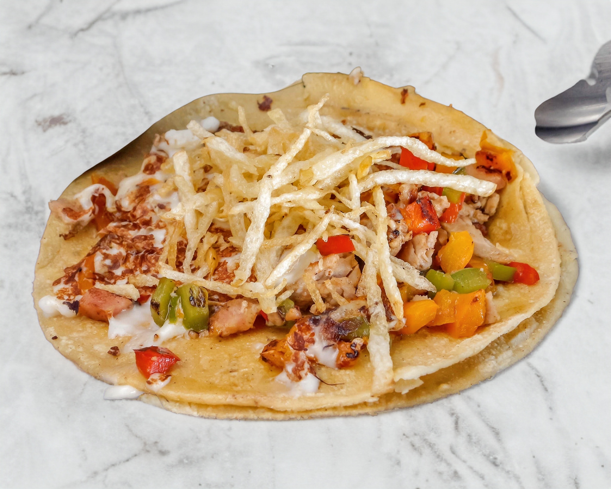 (Tortilla tamaño normal) Pechuga asada, cebolla cocida y papas tipo a la francesa
