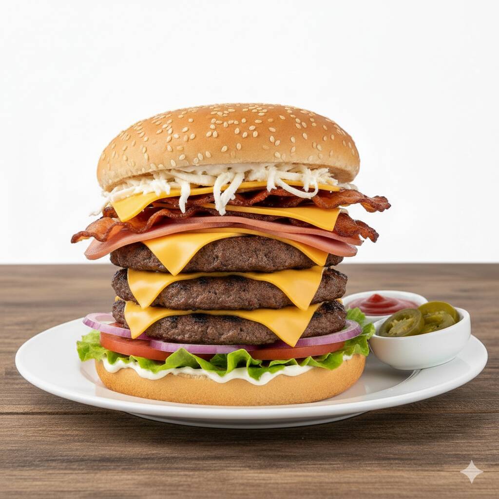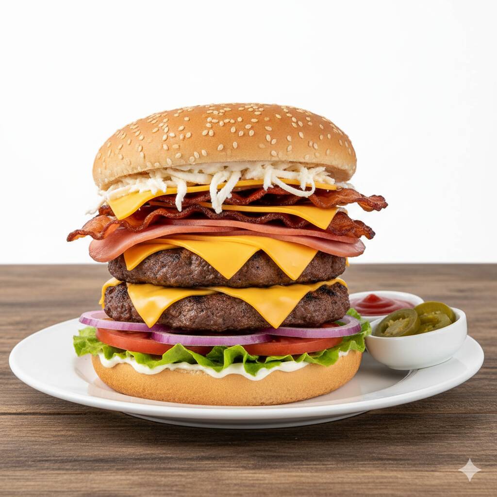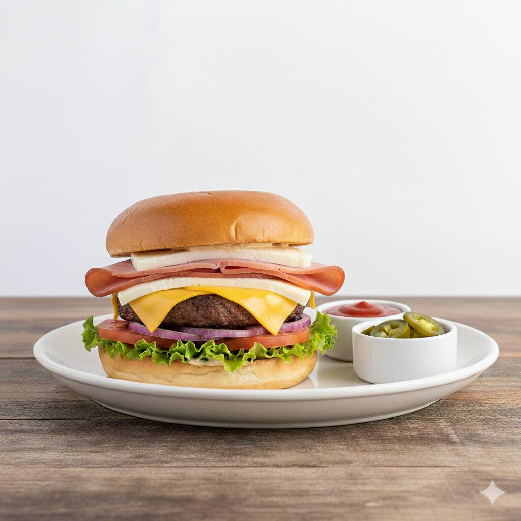 Doble carne, queso amarillo, queso oaxaca, tocino y jamón.