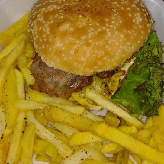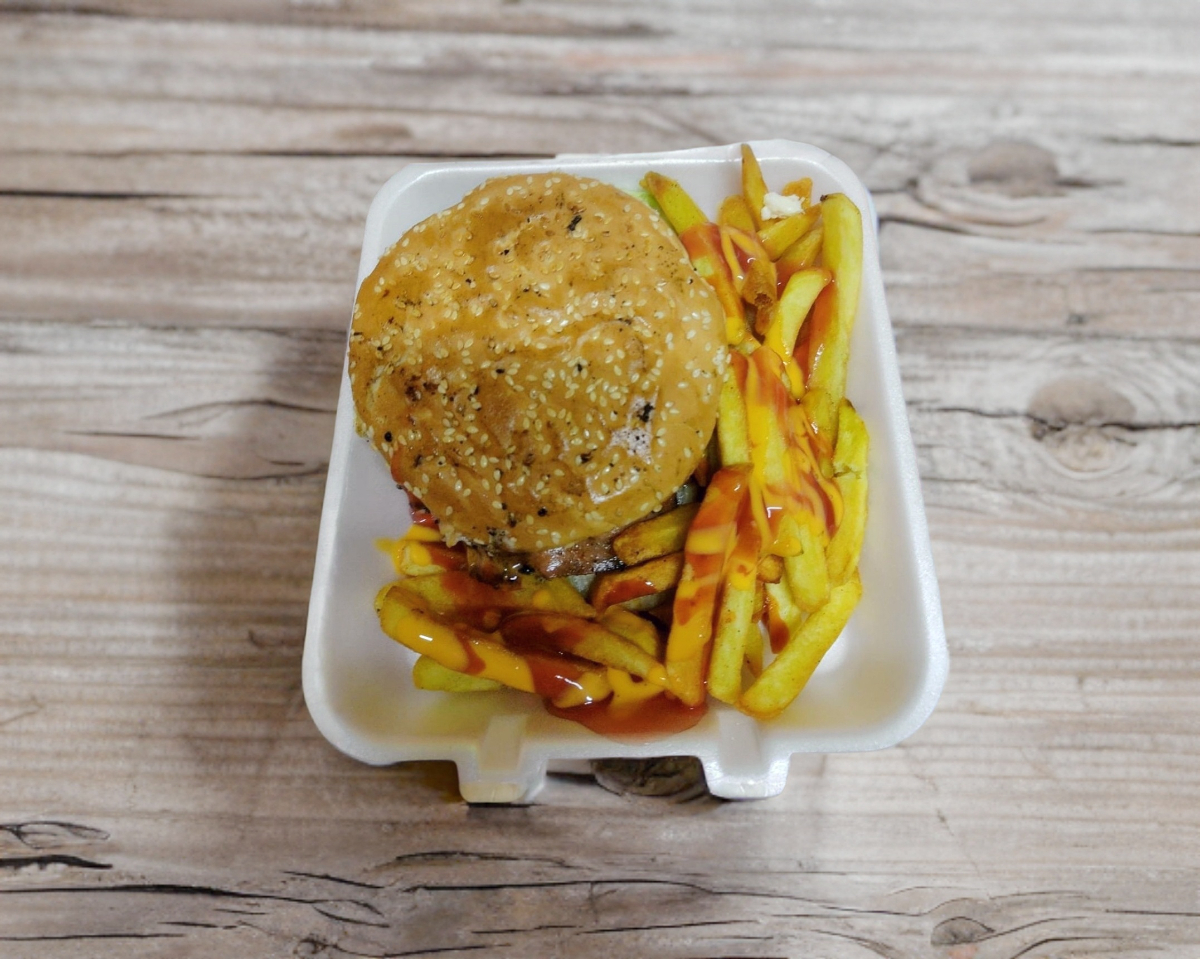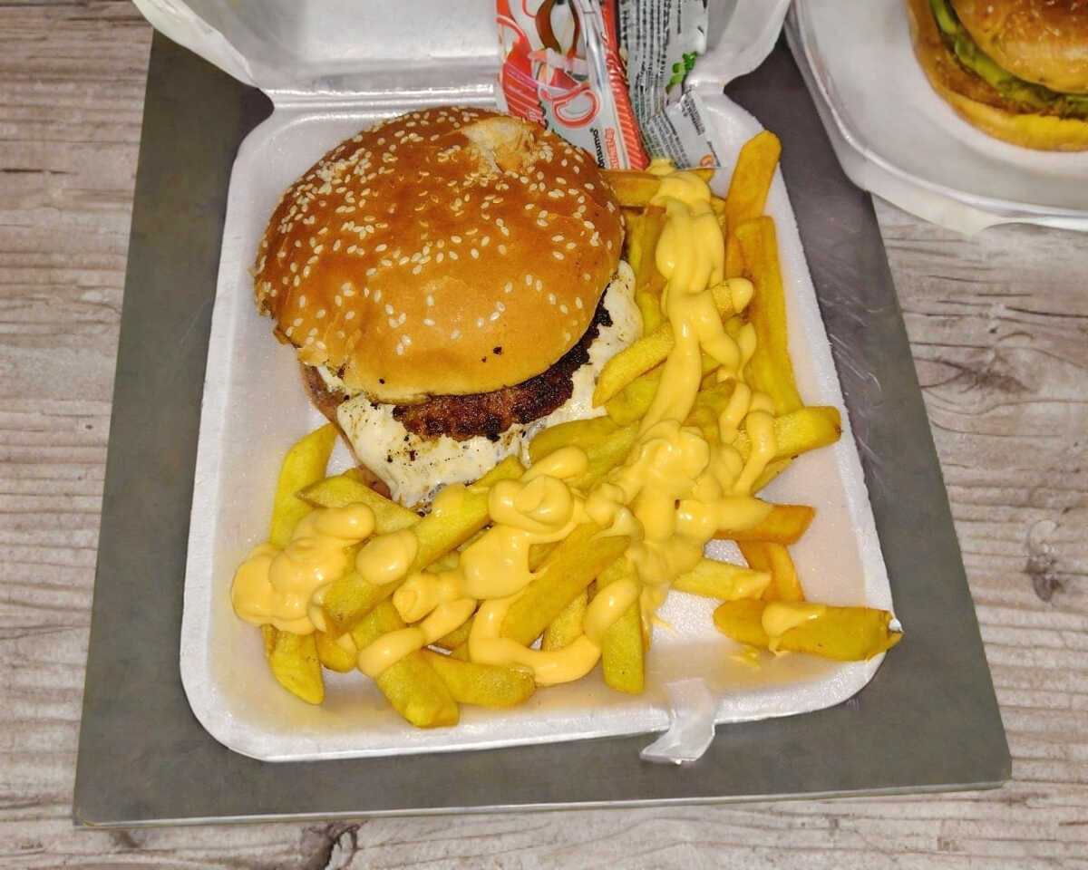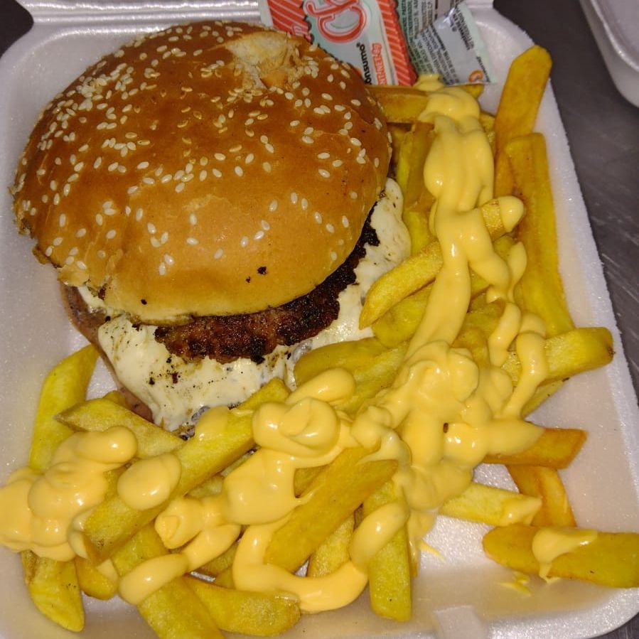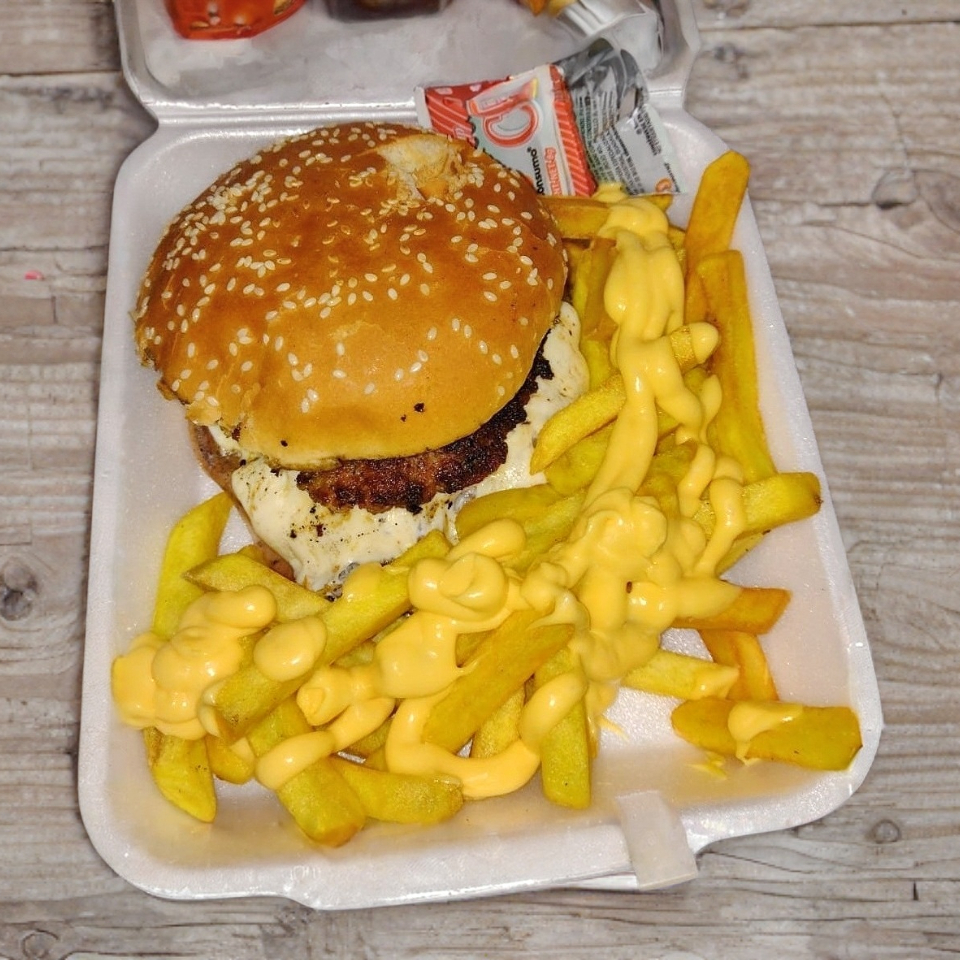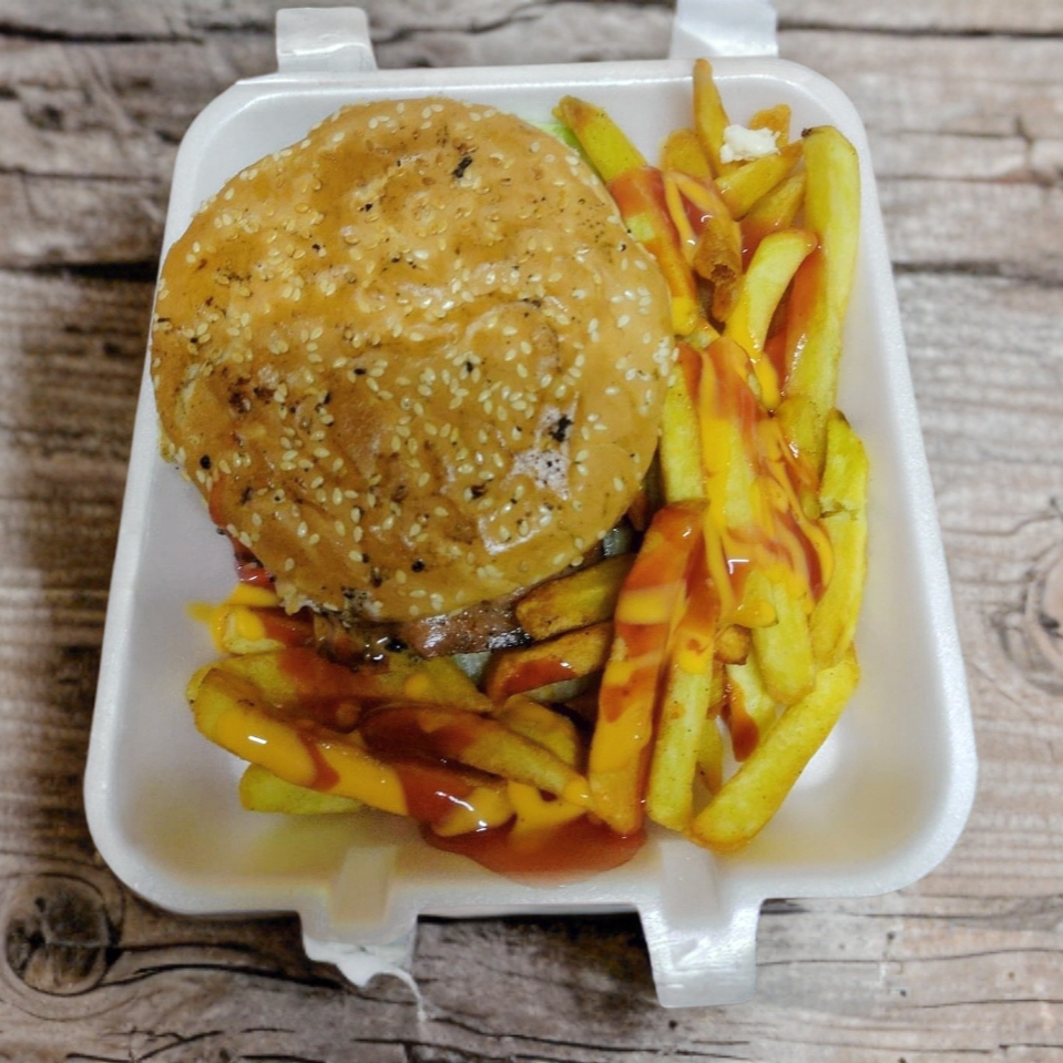 Hamburguesa con Carne de res artesanal, queso amarillo y papas a la francesa ( porción personal), cátsup.
