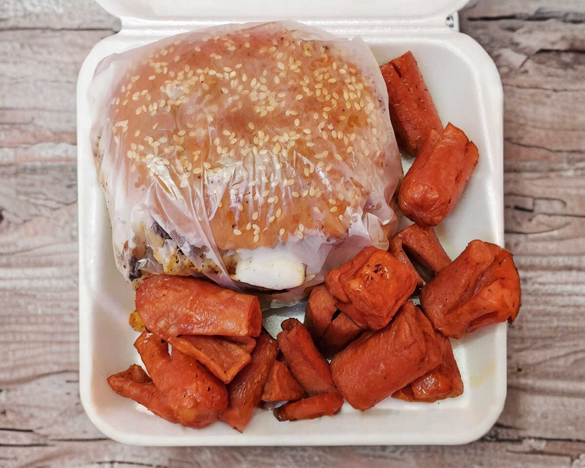 Carne de pollo amón queso oaxaca piña tocino lechuga jitomate y chiles con papas