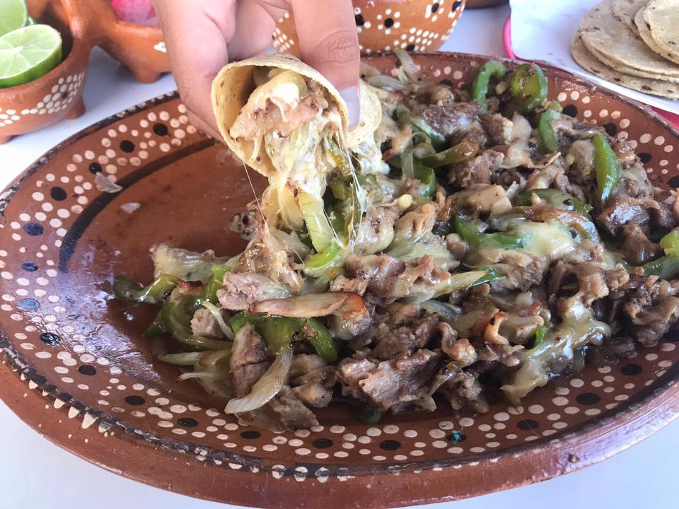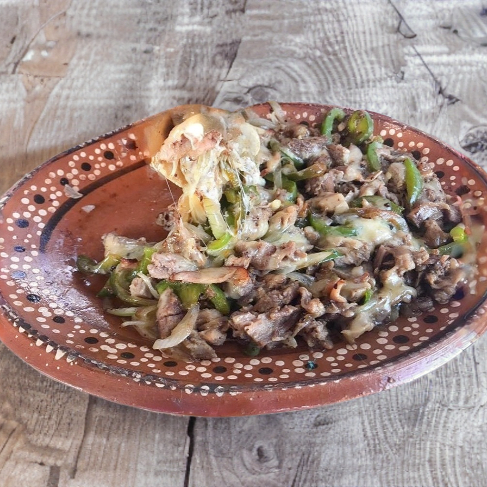 Bistec, longaniza, tocino, queso oaxaca, cebolla morron y 5 tortillas