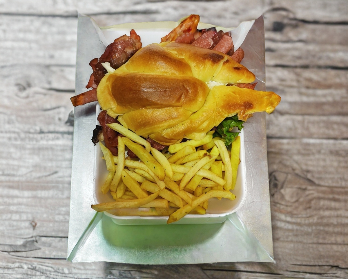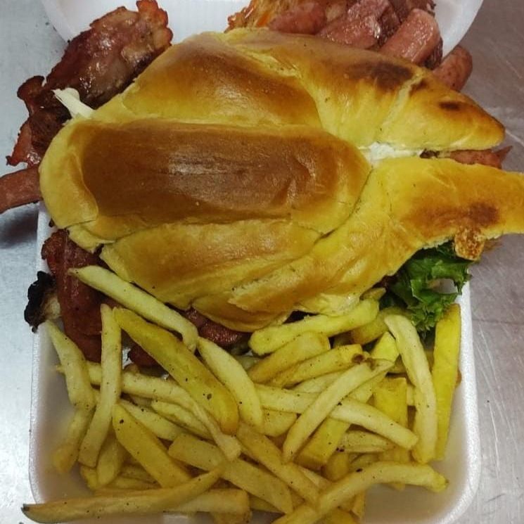2 carnes, de pollo queso oaxaca, jamón, piña, tocino, queso amarillo, lechuga, jitomate y chiles con papas