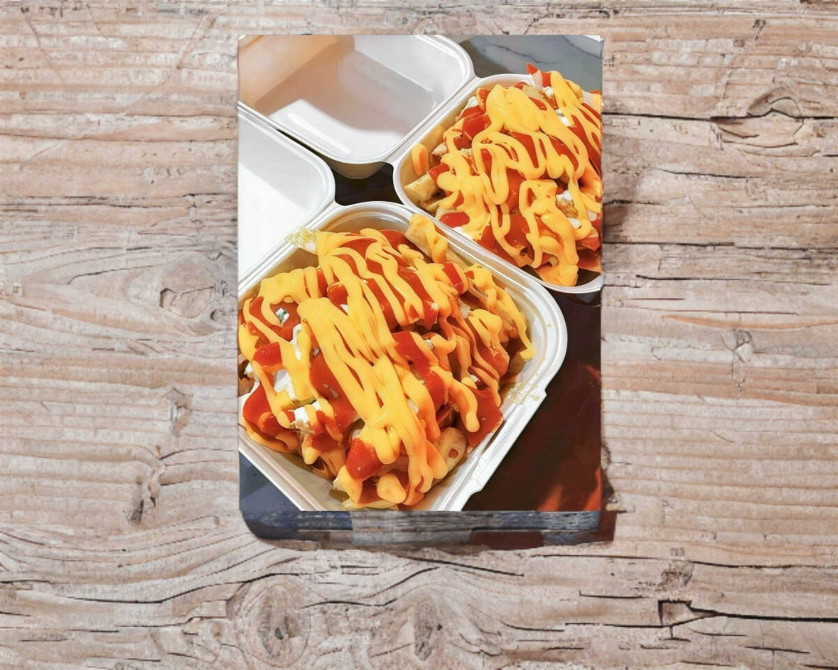Carne de pollo , queso amarillo y papas a la francesa.