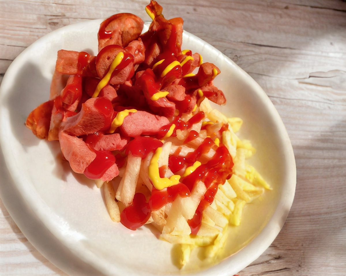 Salchicha en forma de pulpa queso salsa y capsup