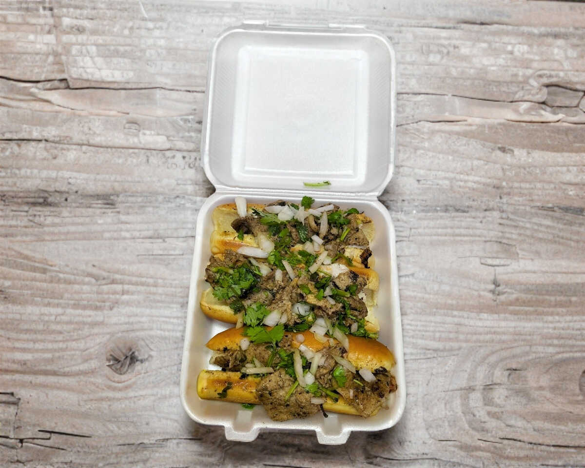 Tres hotdog con bitek y salchicha cebolla jitomate y rajas