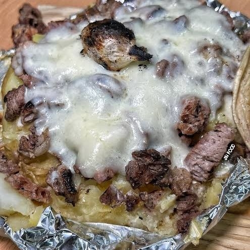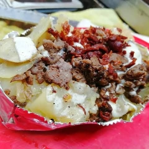 Deliciosa papa cocida con mantequilla envuelto con aluminio, acompañado de carne de suadero y longaniza y crema