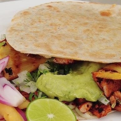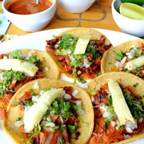Preparado con 3 tortillas de harina, carne de pastor, acompañado de cebolla, cilantro.