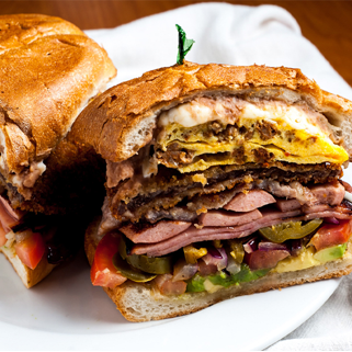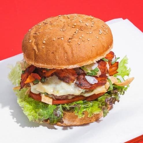 Hamburguesa con doble carne, jitomate, lechuga, cebolla, queso.