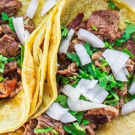 Delicioso taco con doble tortilla de maiz con carne de suadero, acompañado de cebolla, cilantro