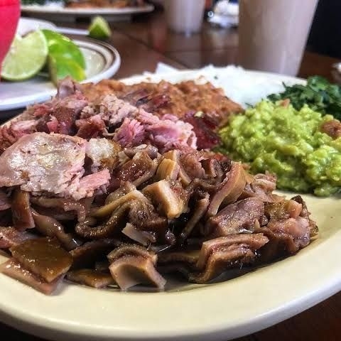Una porción de carne de suadero con longaniza , acompañado de 7 tortillas dobles de maiz,
