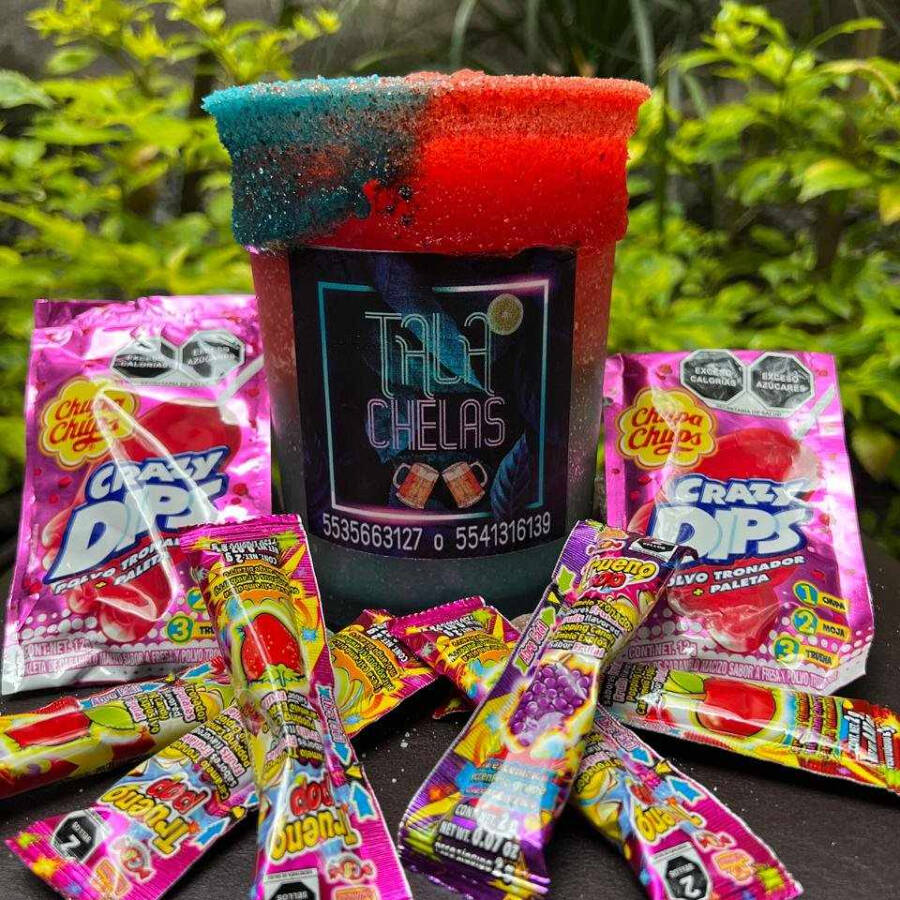 Cerveza clara u oscura, limón, sal, Tajin, Miguelito, Maggi (opcional), Tamborcitos, Pica Fresas.