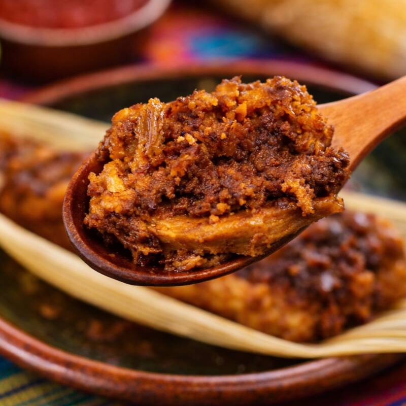 Tamalito de mole artesanal con pechuga de pollo deshebarada.