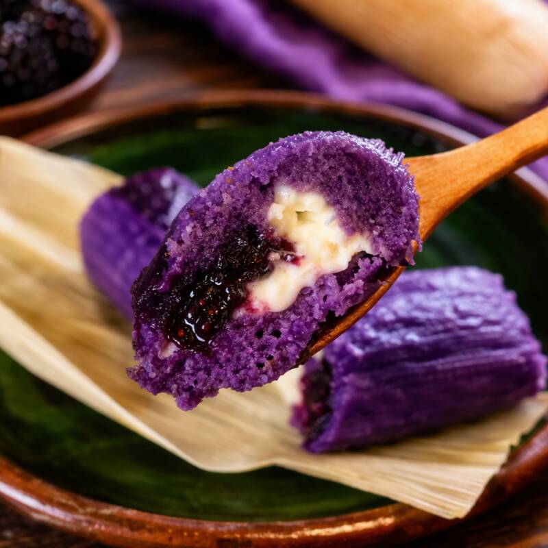 Tamalito de zarzamora con queso philadelphia y mermelada de zarzamora para un sabor dulce y cremoso, masa suave que combina perfecto con el relleno.