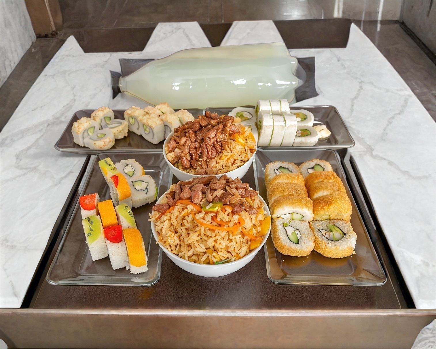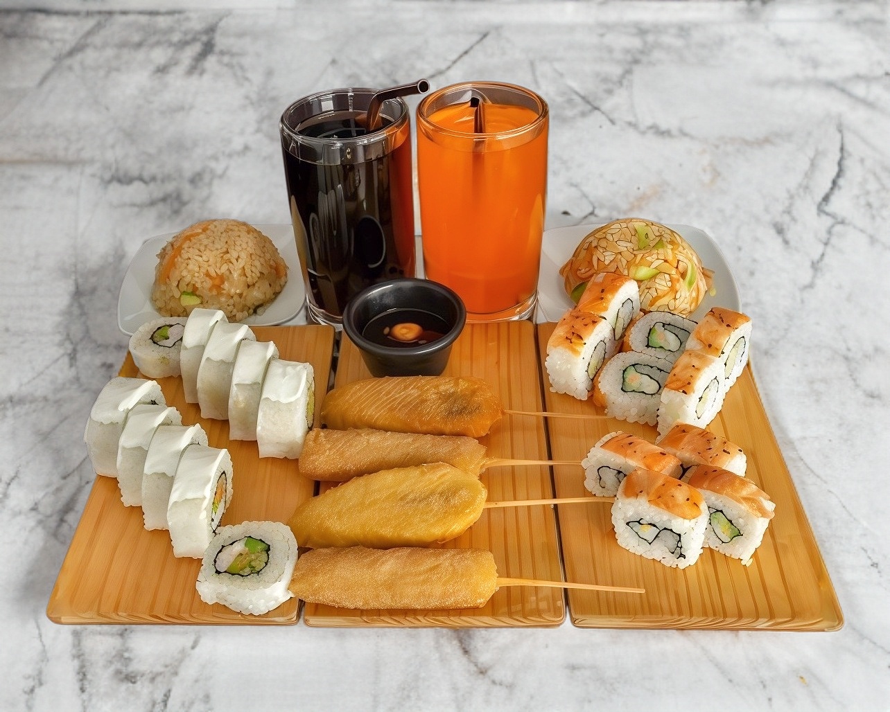 Incluye 2 rollos de sushi de 10 piezas c/u, 2 medias ordenes de yakimeshi sencillo, 4 Piezas de kuxi, Brochetas empanizadas 4 piezas, queso y plátano) más 2 refrescos de sabores de355 ml.
