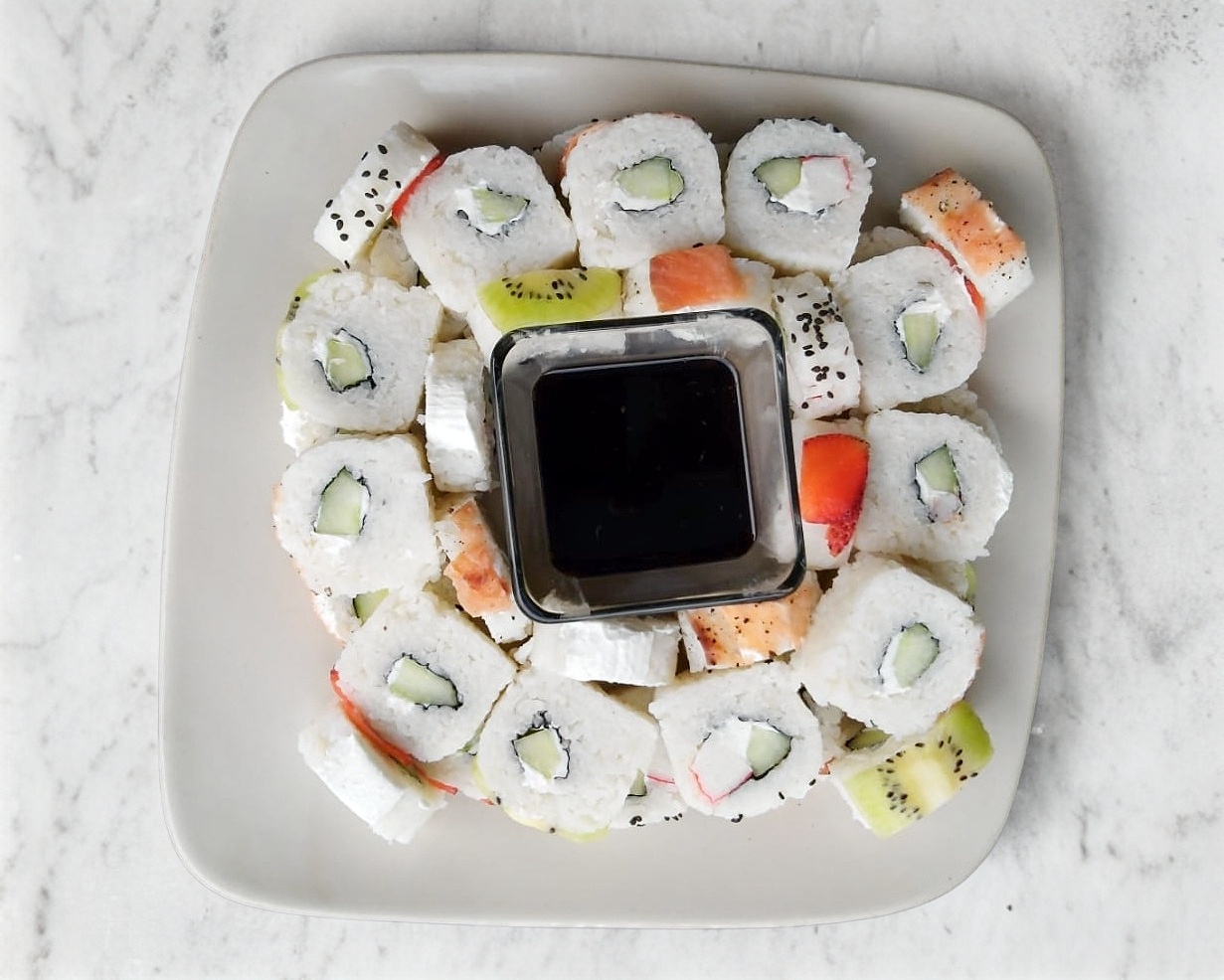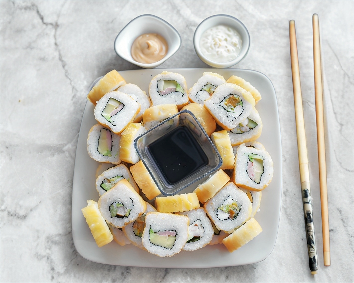 Incluye charola con 4 rollos (40 bocadillos ) ebi maki empanizado, arcoíris empanizado, 2 yakimeshi sencillos (Carne o pollo) más 1 refresco de 2 litros de sabor.