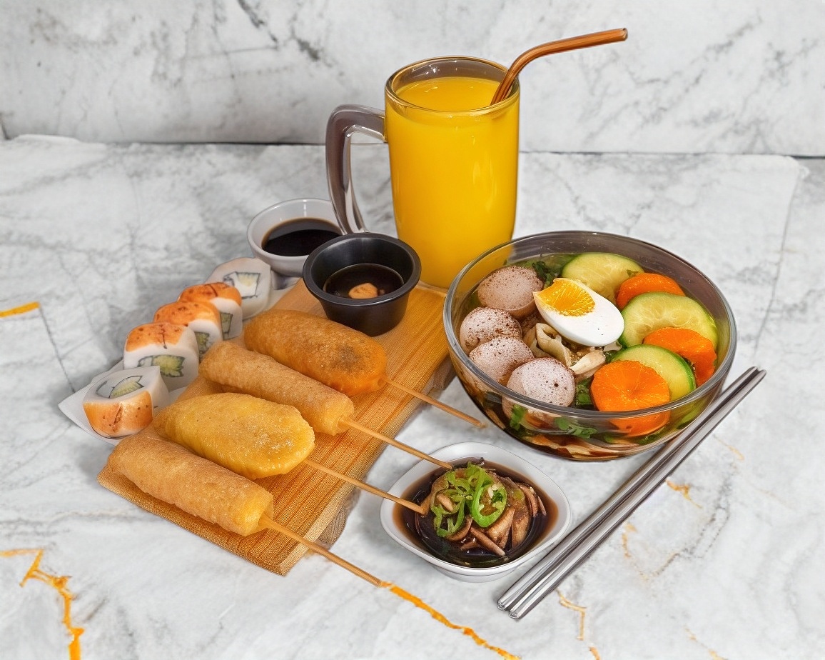 Incluye 1 ramen tradicional chico, 5 bocadillos de sushi, 2 kushis (brochetas empanizadas de plátano y queso) más 1 refresco de 355ml.