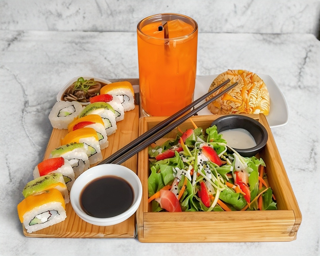 1 Rollo de sushi (10 porciones) más guarnición de yakimeshi 1/2 tazón (Arroz frito con verduras y ensalada tamashi con base de 2 lechugas verdura y fruta con aderezo y espolvoreado de sésamo negro) y refresco de sabor de 355ml.