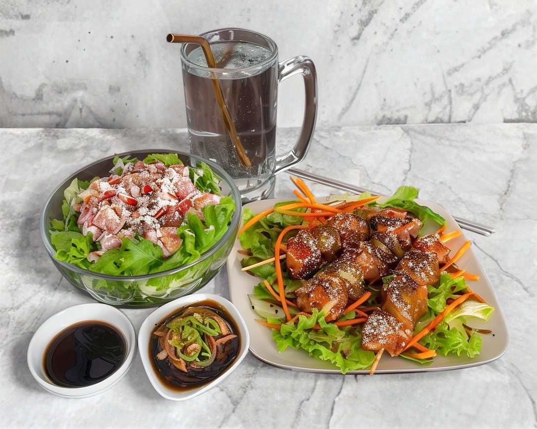 Incluye orden de yakitoris de carne (3 piezas de brochetas de carne y verdura en salsa agridulce) más ensalada de mar (ceviche de camarón y surimi aderezado con limón y mayonesa) con refresco de 355 ml.
