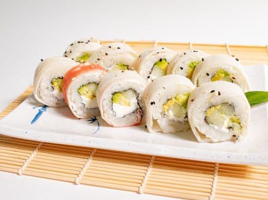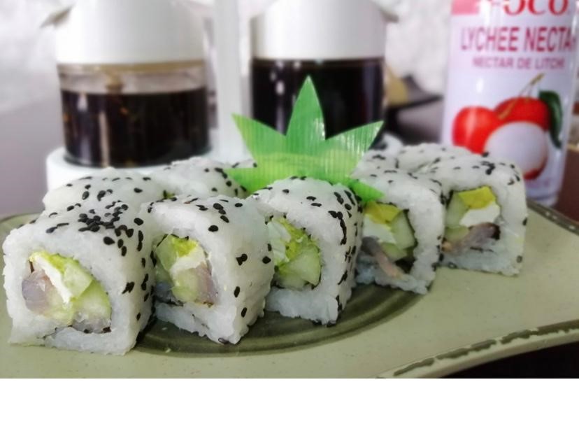 Rollo tanjuna (sin proteína): queso crema, aguacate y pepino. Arroz y ajonjolí por fuera. Por dentro queso philadelphia.