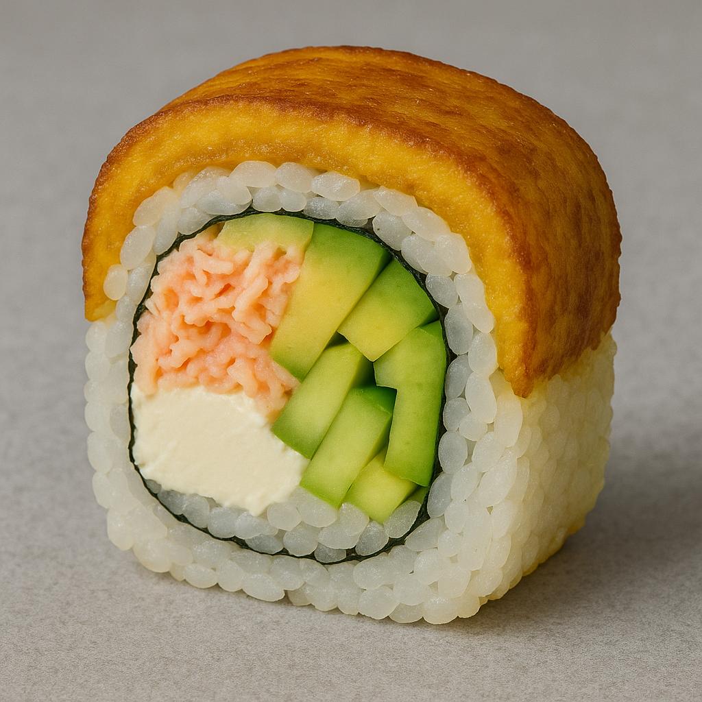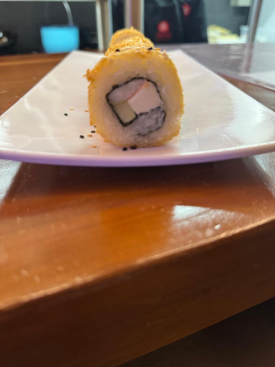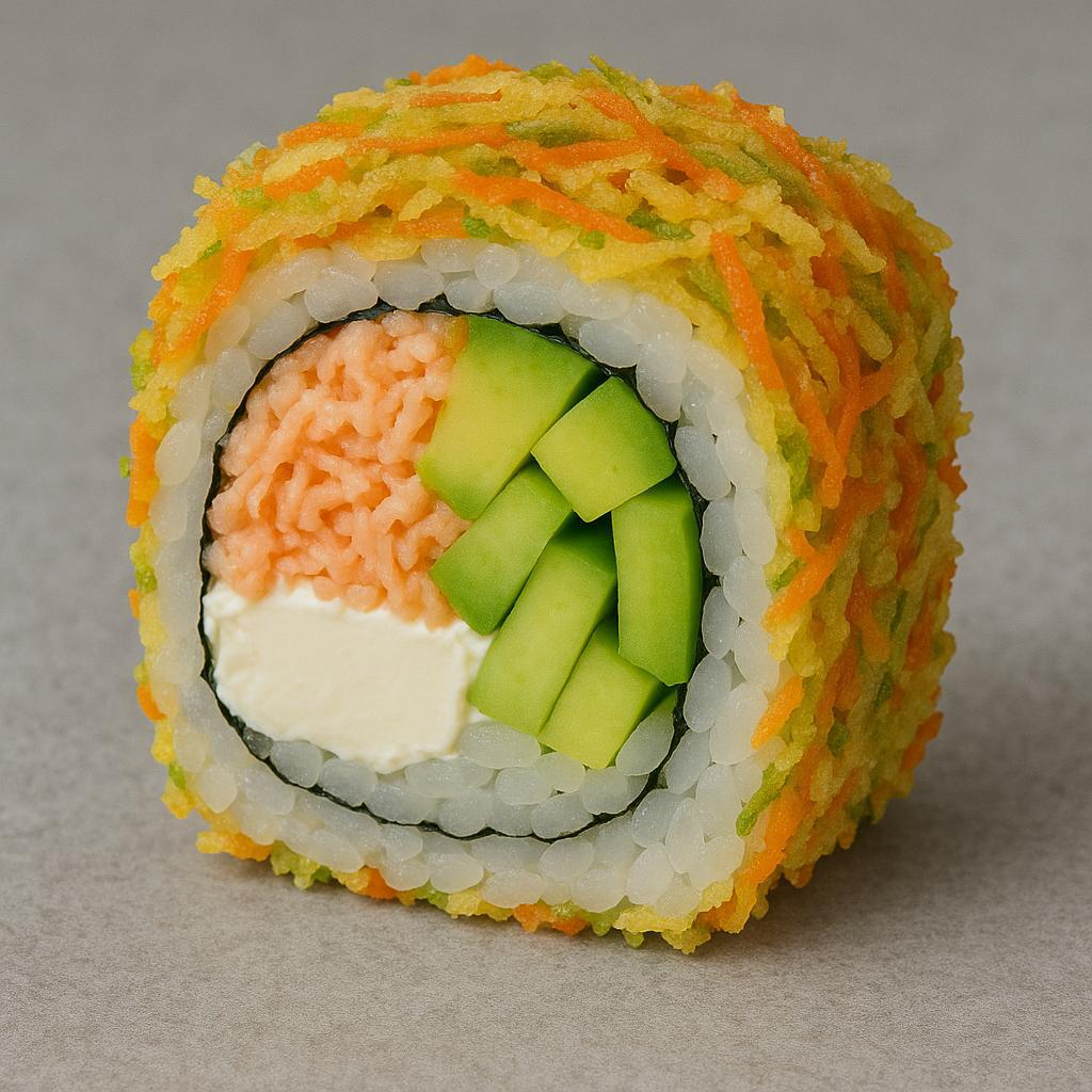 Por fuera: Queso crema. Por dentro: camarón empanizado, aguacate y pepino.