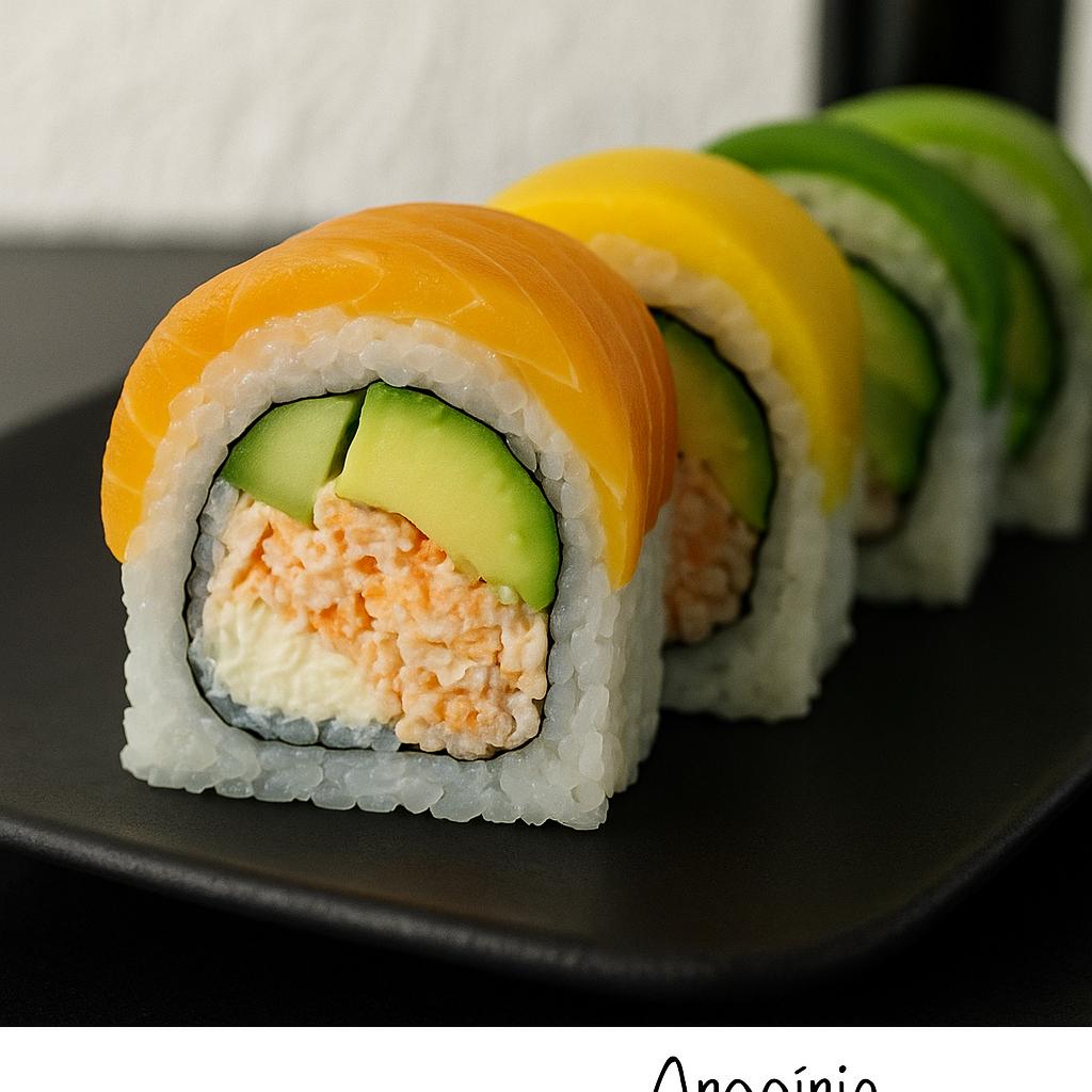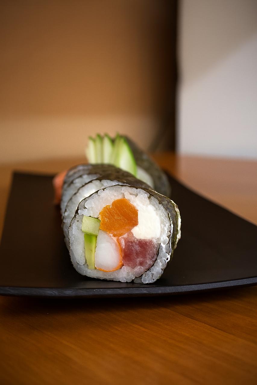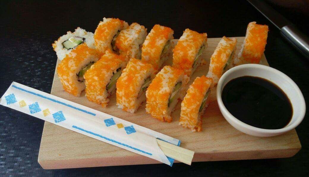 Por fuera: salmón, pescado, masago y aguacate. Por dentro: queso crema, aguacate y pepino).