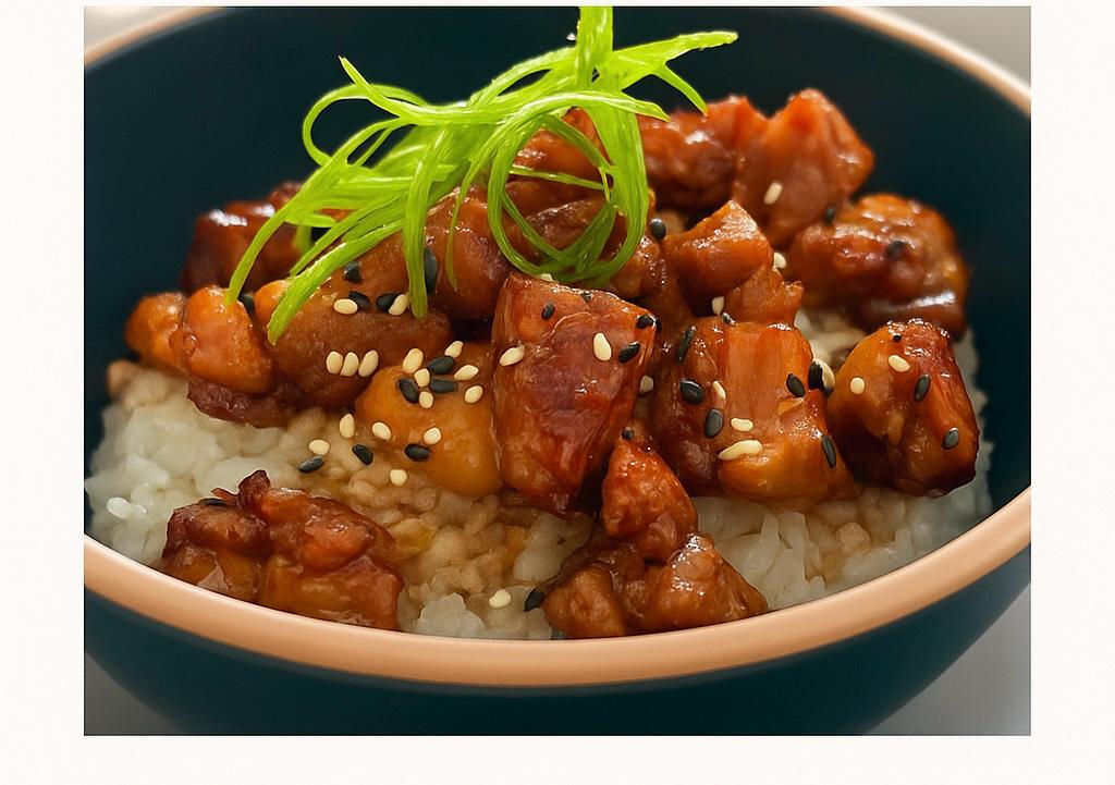 Torimeshi don (trocitos de pollo aderezados con una salsa ligeramente dulce sobre una porción de arroz al vapor).