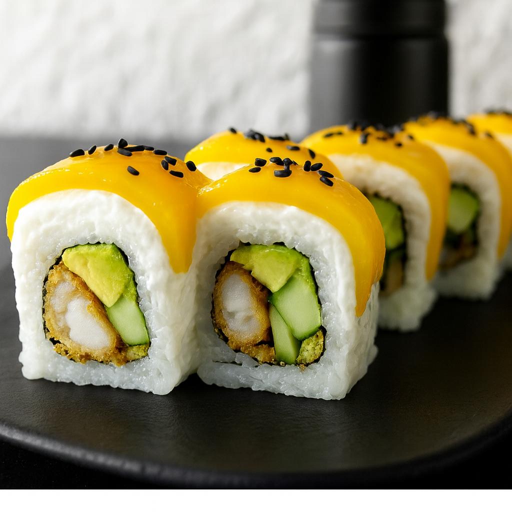 Por fuera: queso crema y mango. Por dentro: camarón empanizado, aguacate y pepino).