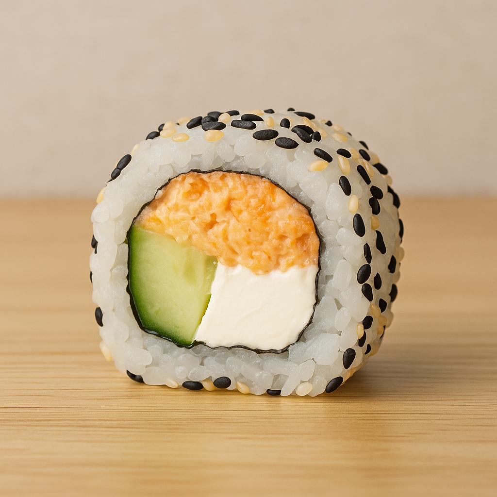 Por fuera: ajonjolí. Por dentro: Queso crema, pepino y Tampico.