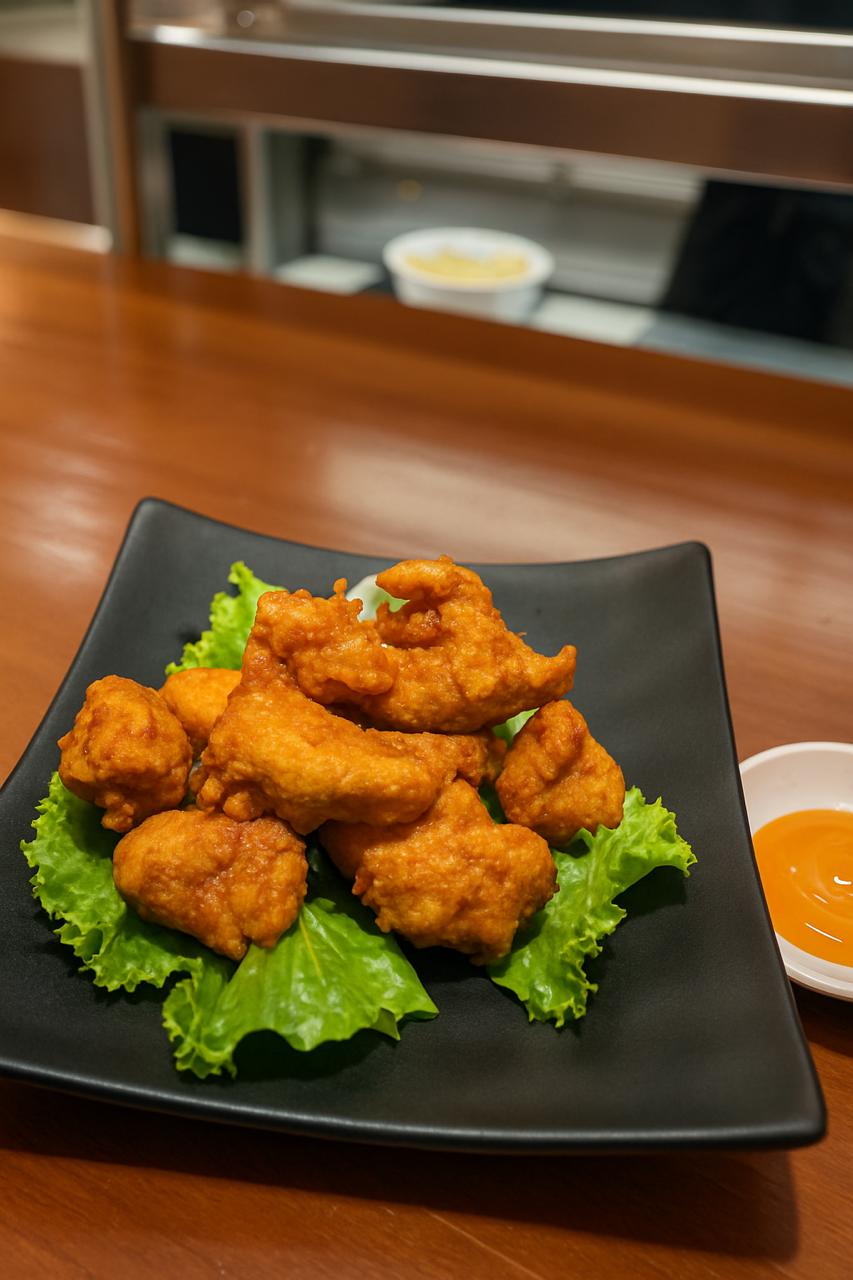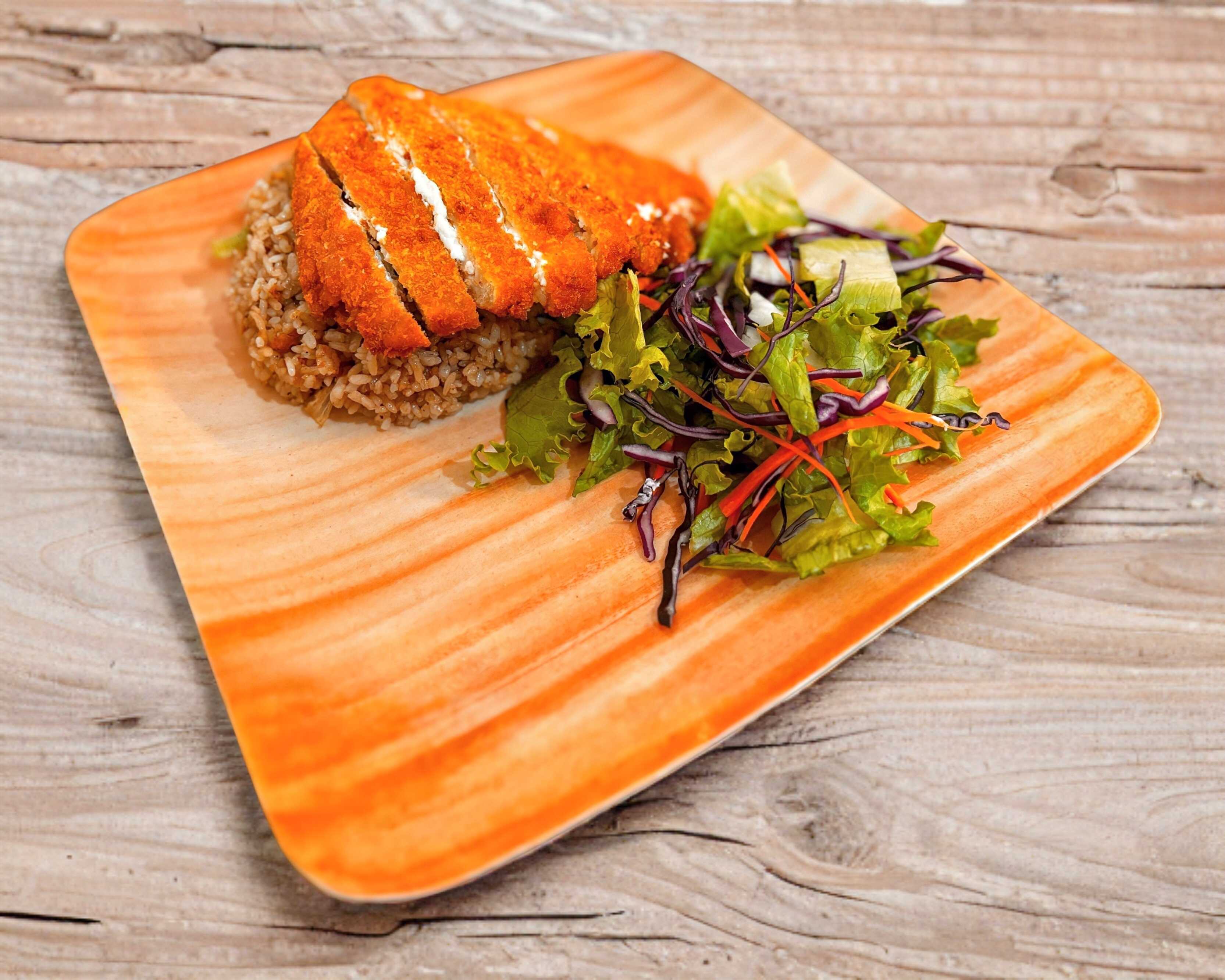 Milanesa de pollo cujiente rellena con queso de calidad. Incluye yakimeshi japones (arroz) y ensalada fresca.