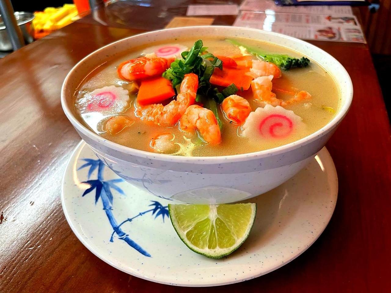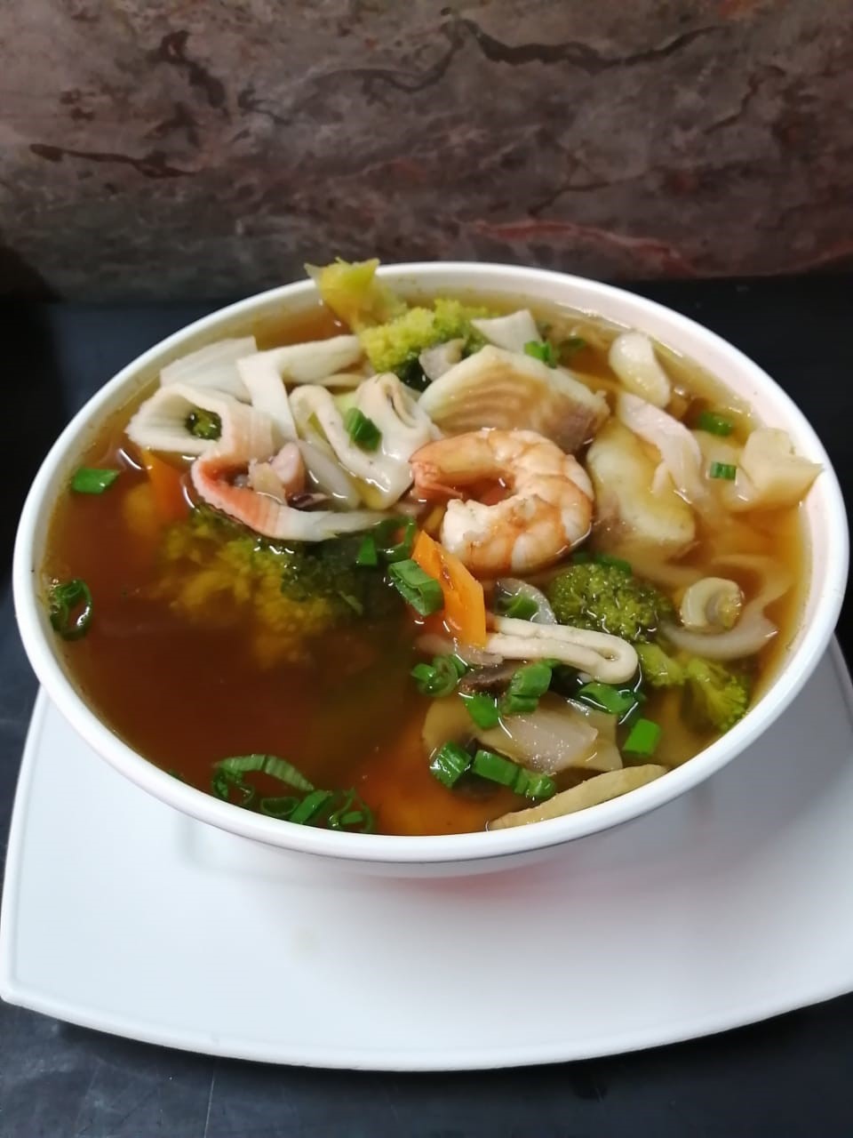 Sopa gomuku especial (sopa con pulpo, calamar, surimi, camarón y pecado).
