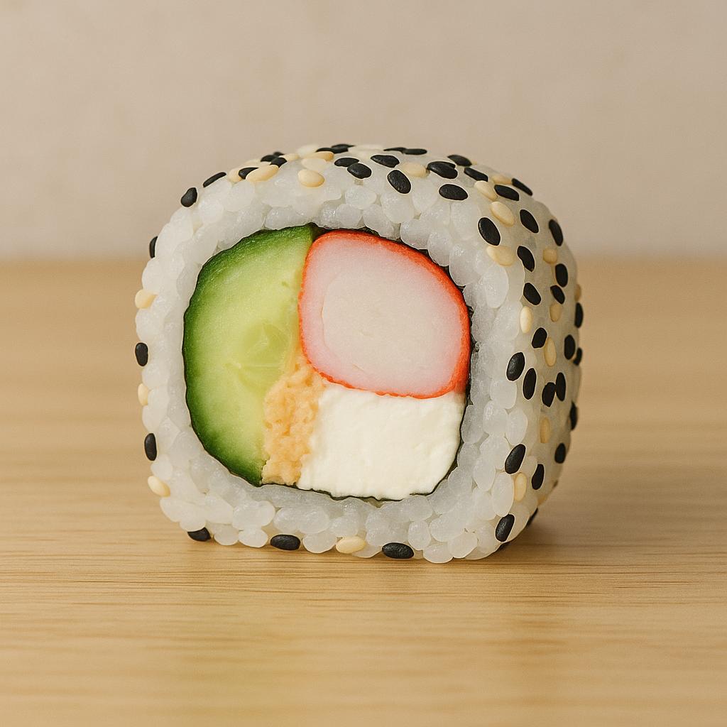Rollo kanikama sencillo (surimi): arroz y ajonjolí por fuera, por dentro queso philadelphia, aguacate y pepino.