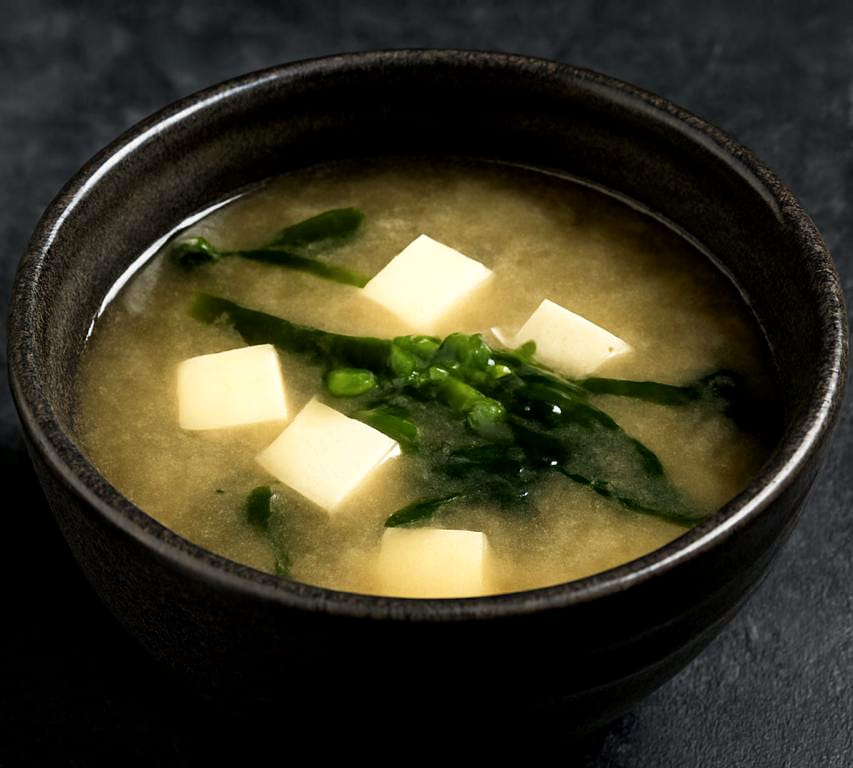 Caldo de soya con miso, tofú, alga wakame y cebollín