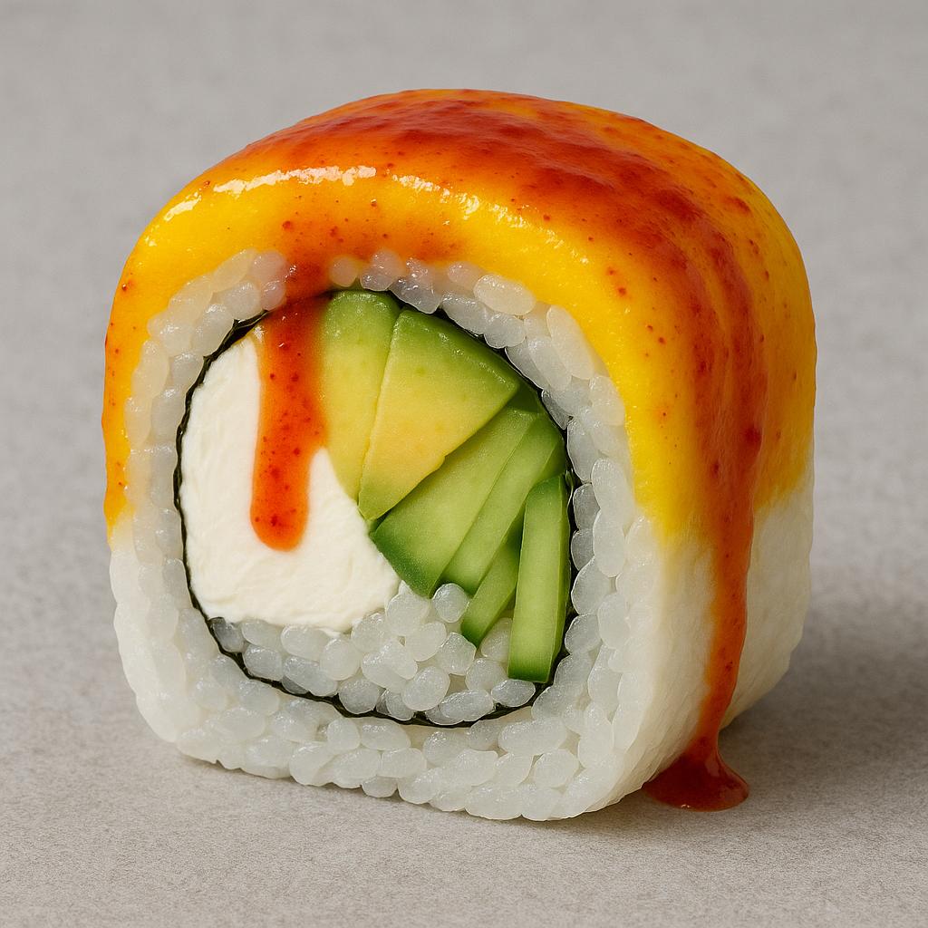 Por fuera: mango y chamoy. Por dentro: queso crema, aguacate y pepino