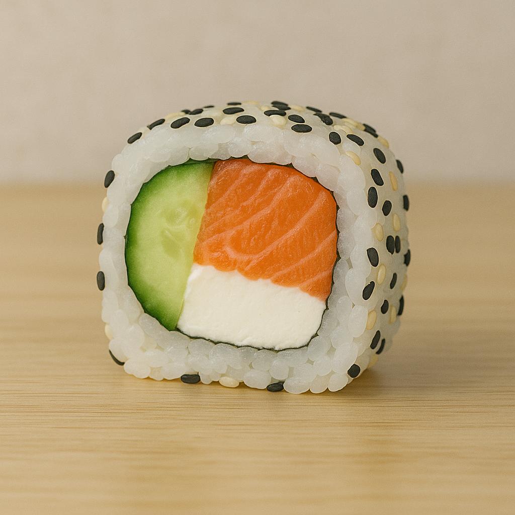 Por fuera: ajonjolí. Por dentro queso crema, pepino y salmón fresco.