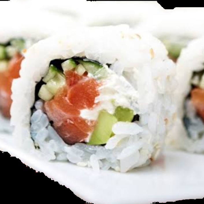Rollo philadelphia sencillo (salmon): arroz y ajonjolí por fuera, por dentro queso philadelphia, aguacate y pepino.