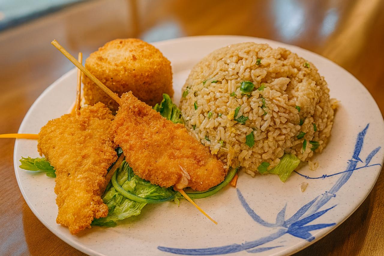 Una pequeña porción de arroz frito, 2 piezas de brochetas (pollo o queso) y un oniguiri de queso crema.
