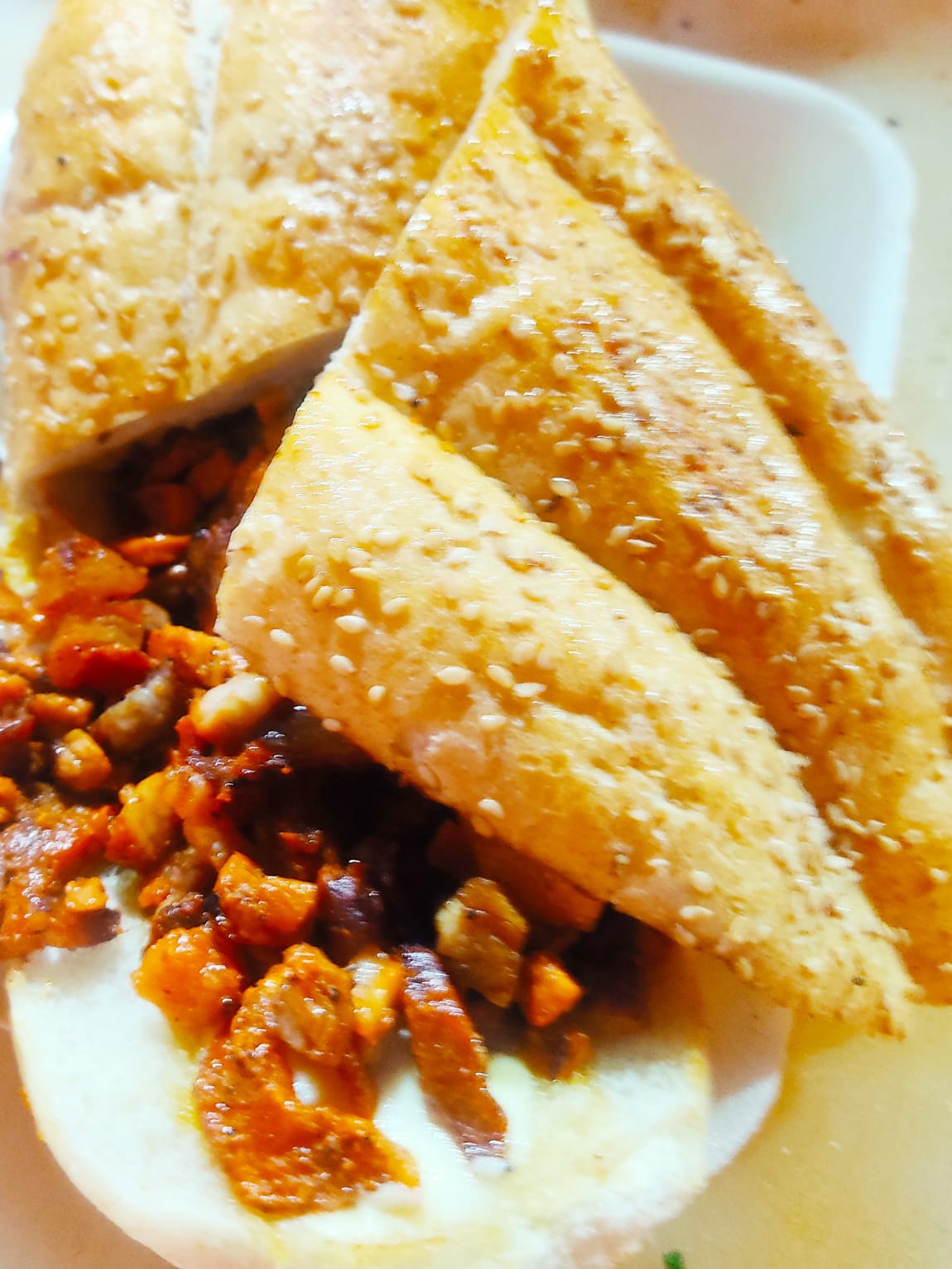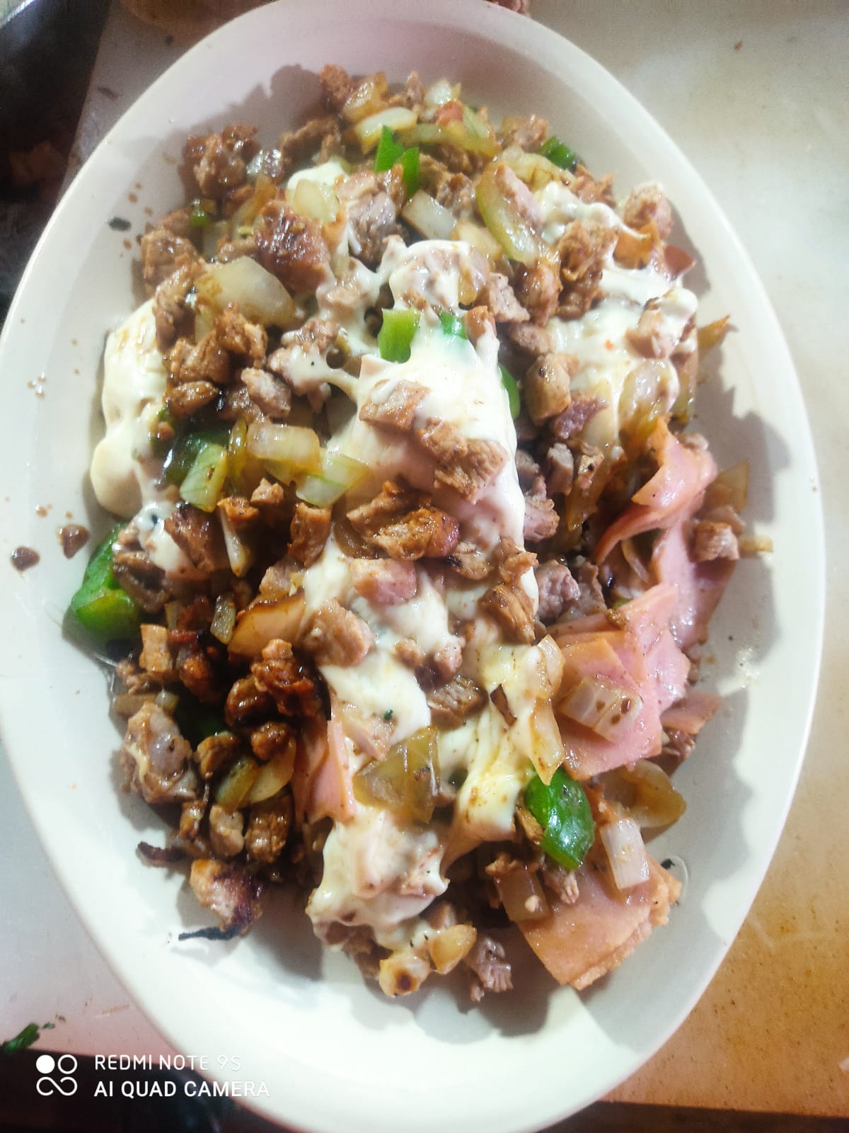 Lleva bistec, jamón, cebolla, chile morrón y queso.