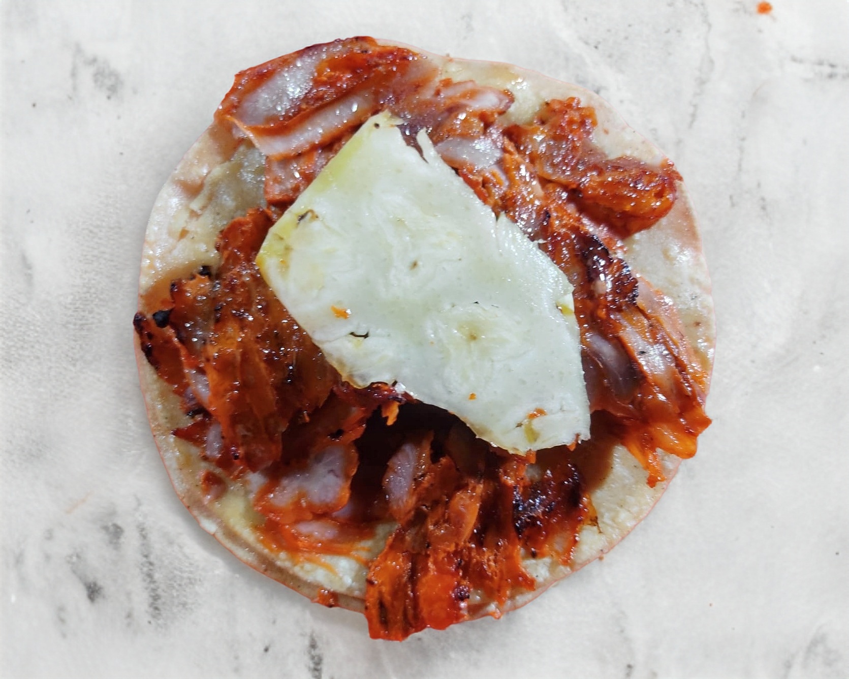 Lleva pastor, longaniza, bistec, jamón, piña y queso.