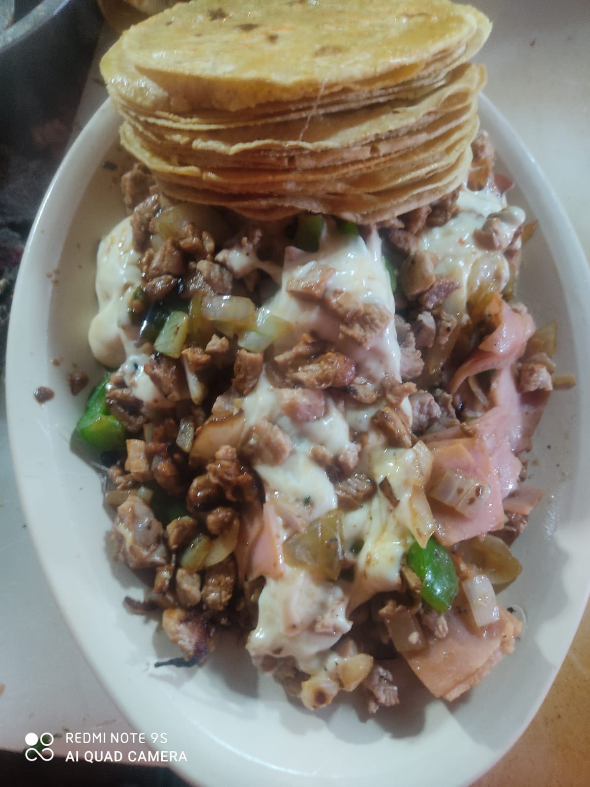 1kg de tortillas, salsas roja y verde, pico de gallo, cebolla y cilantro, cebollitas de cambray , pepinos, 1 refresco familiar de 2 lt