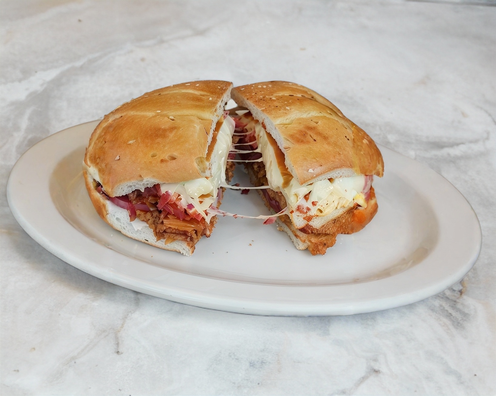 170 g de bistec, cebolla, tocino, jamón, quesillo y morrón
