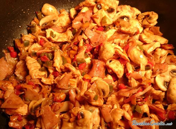 170 g pechuga de pollo, cebolla, tocino, jamón, quesillo y morrón