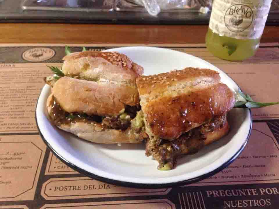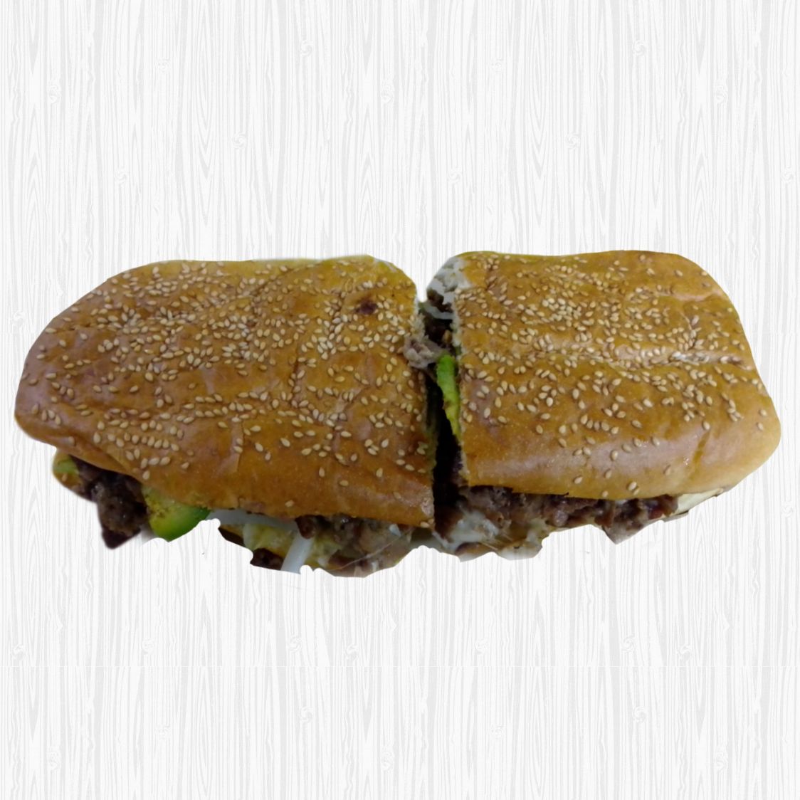 220 g de milanesa, pierna y quesillo. Mayonesa, lechuga, jitomate, aguacate y cebolla