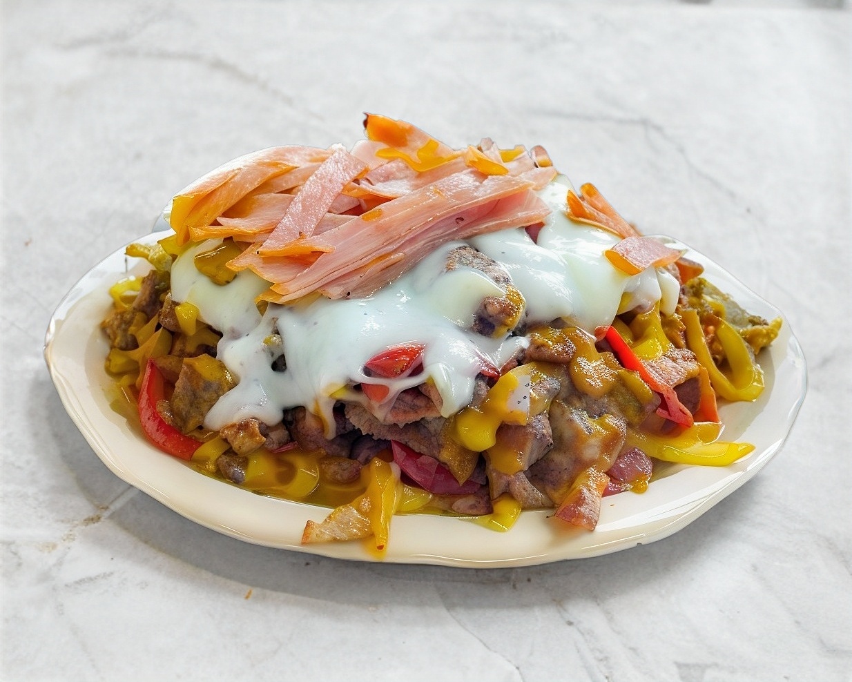 170 g de chuleta fresca, cebolla, tocino, jamón, quesillo y morrón