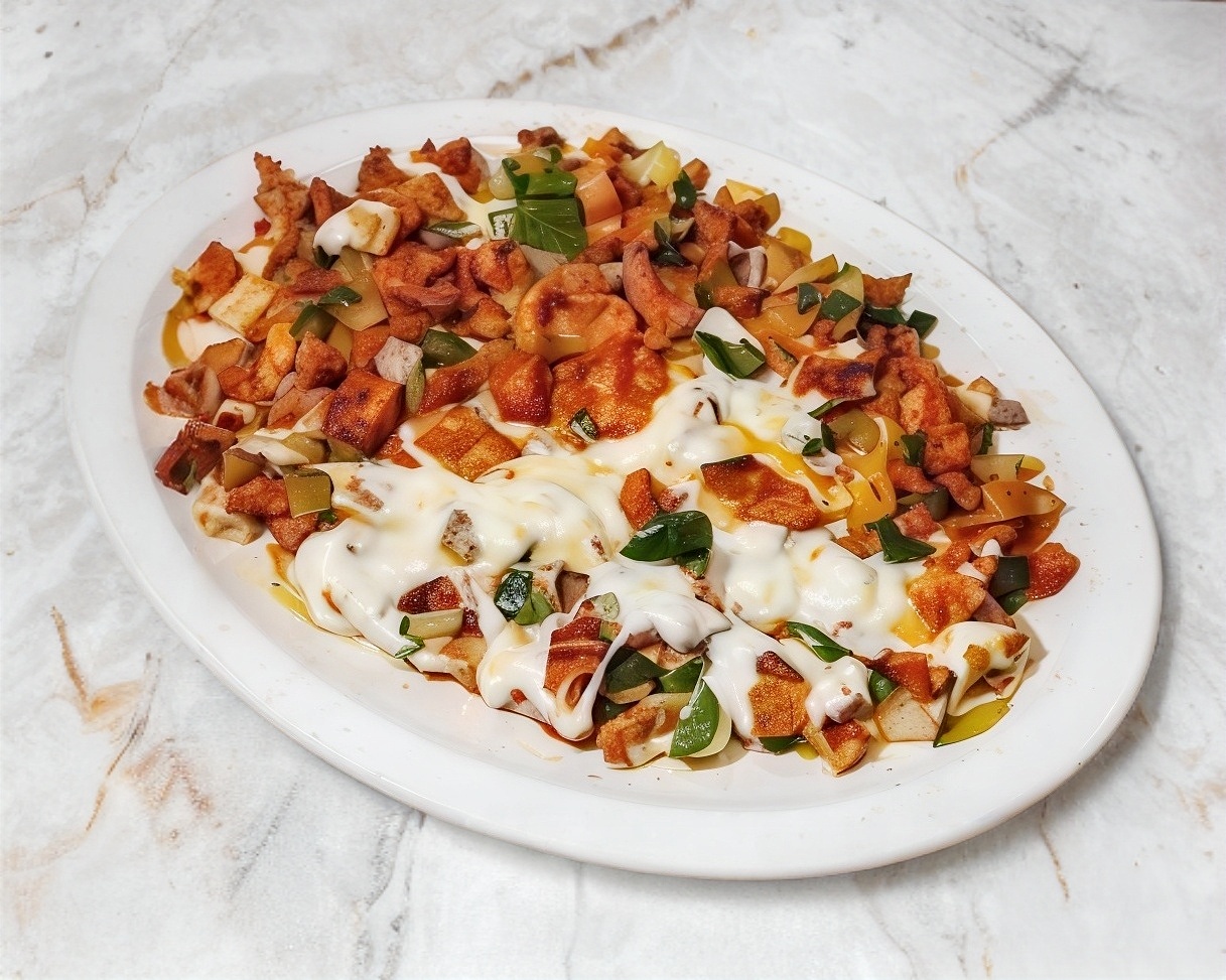 185 g de bistec con Pastor, chorizo, pierna, salchicha, cebolla, tocino, jamón, quesillo y morrón