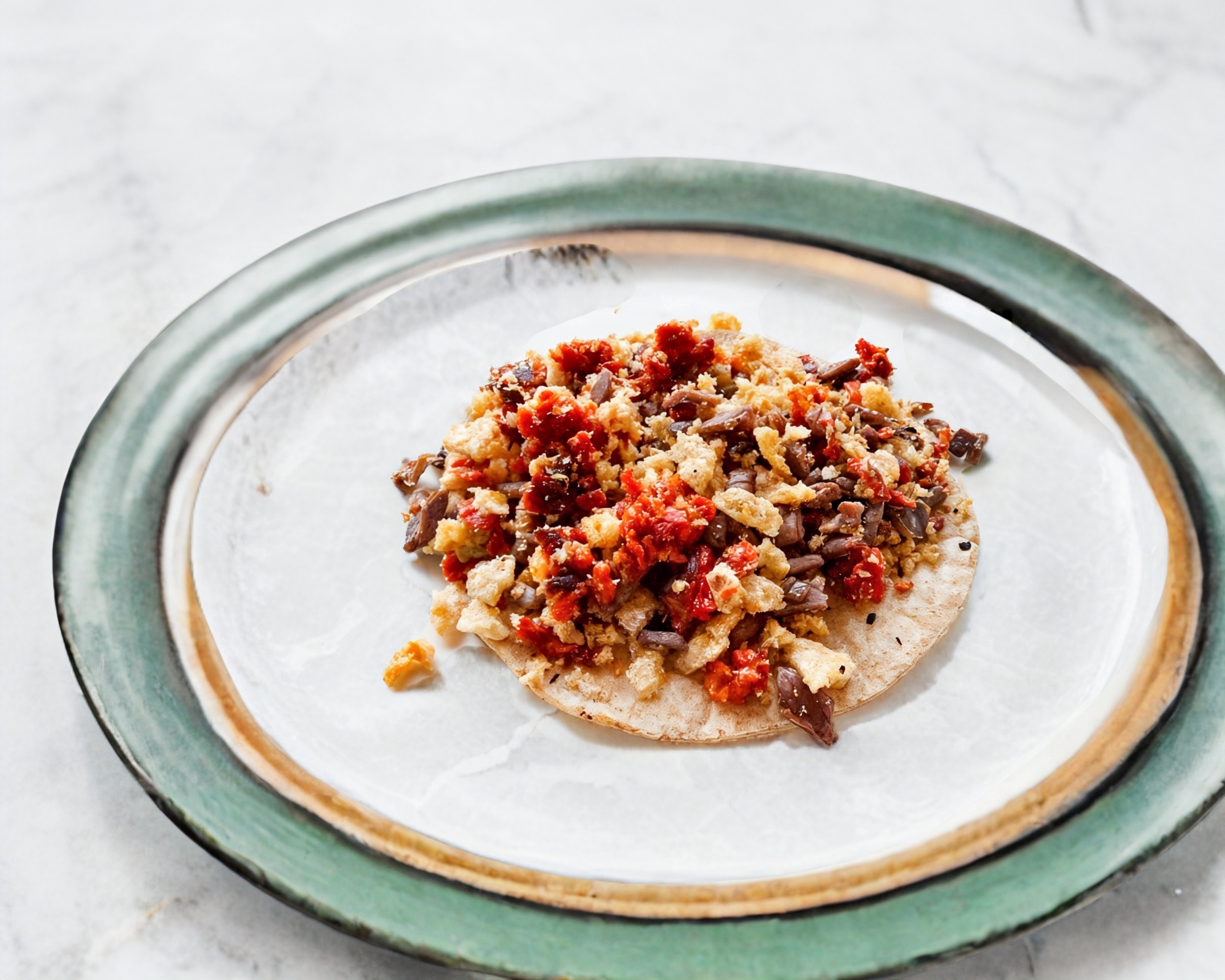 Tortilla doradito embarrado de frijoles refritos, carne de su preferencia, quesillo y aguacate.